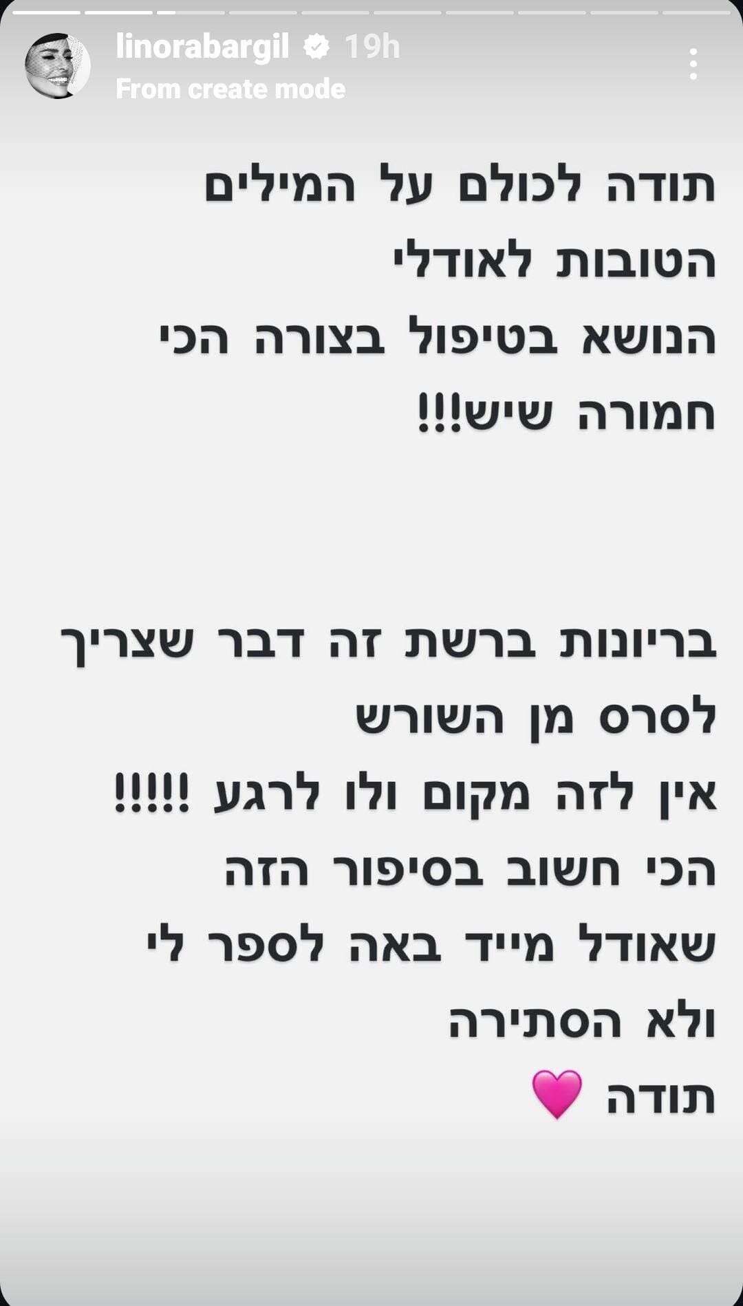 "מי שמתעסק עם הילדים שלי זה העקב אכילס שלי, אני לא יכולה לתפקד. אם יש משהו שגומר אותי ואני הופכת להיות אריה נמר, זה שם. כל כך כאב לי על הילדה. יש לי ילדה צדיקה. באמת. מי שמכיר את אודלי שלי, זה משהו שהוא לא רגיל. כאב לי כל כך לראות אותה בסיטואציה הלא נורמלית הזו", אמרה ובסיום ביקשה להעביר מסר להורים: "אני מחזקת את כל ההורים שהילדים שלהם עוברים דברים דומים - תעשו הרבה רעש. אל תפחדו לעמוד מול זה. תראו לילדים שלכם שאתם פה בשבילם. כל מקרה קשה שהילדים קודם כל יבואו אליכם שיבינו שאתם תהפכו את העולם בשבילם. שיהיו לנו בשורות טובות, אמן".