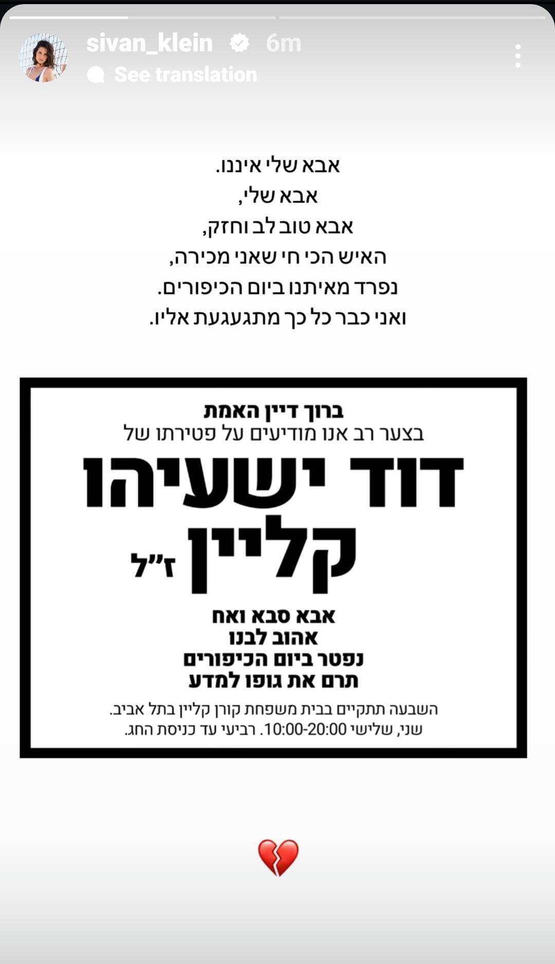 "אבא שלי איננו", כתבה סיוון (40) מעל למודעת האבל שצירפה לסטורי והוסיפה בכאב: "אבא שלי, אבא טוב לב וחזק, האיש הכי חי שאני מכירה נפרד מאיתנו ביום הכיפורים ואני כבר כל כך מתגעגעת אליו", הוסיפה כשבמודעת האבל נכתב כי במותו תרם את גופו למדע.