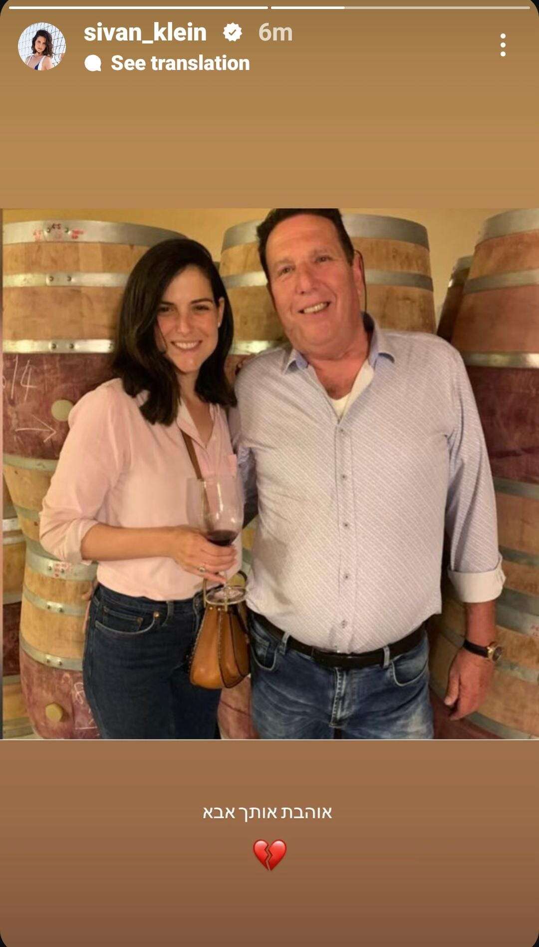 בסטורי נוסף שיתפה סיוון בתמונה שלה לצד אביה ביקב כששניהם אוחזים בכוס יין והיא מוסיפה את הכיתוב "אוהבת אותך אבא" בתוספת אמוג'י של לב שבור.
