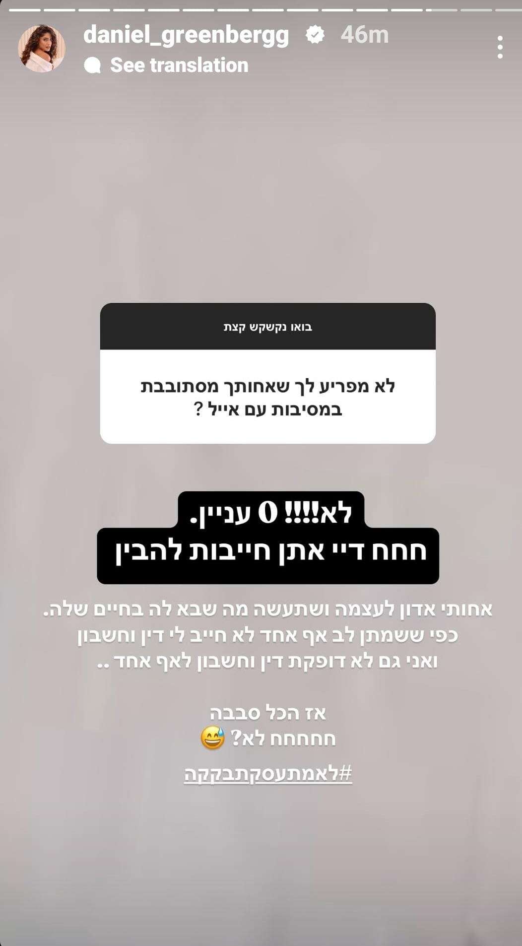 "לא מפריע לך שאחותך מסתובבת במסיבות עם אייל?", נשאלה. "לא!!!! אפס עניין", ביקשה להבהיר באופן חד משמעי. "חחח די. אתן חייבות להבין. אחותי אדון לעצמה ושתעשה מה שבא לה בחיים שלה", הוסיפה כשהיא מכריזה: "כפי ששמתן לב, אף אחד לא חייב לי דין וחשבון ואני גם לא דופקת דין וחשבון לאף אחד אז הכל סבבה. לא?", סיכמה כשהיא חותמת את התשובה בהאשטאג עוקצני אך בעל מסר נחרץ "לא מתעסקת בקקה".