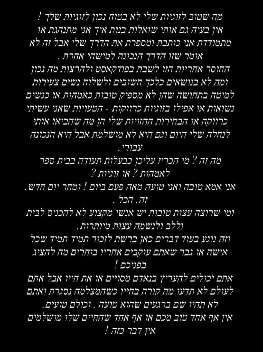 בהמשך הוסיפה וכתבה: "מה שטוב לזוגיות שלי, לא בטוח נכון לזוגיות שלך. אין בעיה - גם אותי שואלות בנות איך אני מתנהגת או מתמודדת, ואני כותבת ומספרת את הדרך שלי אבל זה לא אומר שזו הדרך הנכונה למישהי אחרת. חוסר האחריות הזו לשבת בפודקאסט ולהרצות מה נכון ומה לא בנושאים כל כך חשובים ולשלוח נשים צעירות למיטה בתחושה שהן לא מספיק טובות כאימהות או כנשים נשואות או אפילו בזוגיות כרווקות. הטעויות שאני עשיתי כרווקה או הבחירות ההזויות שלי הן מה שהביאו אותי לנחלה שלי היום וגם היא לא מושלמת, אבל היא הנכונה עבורי".