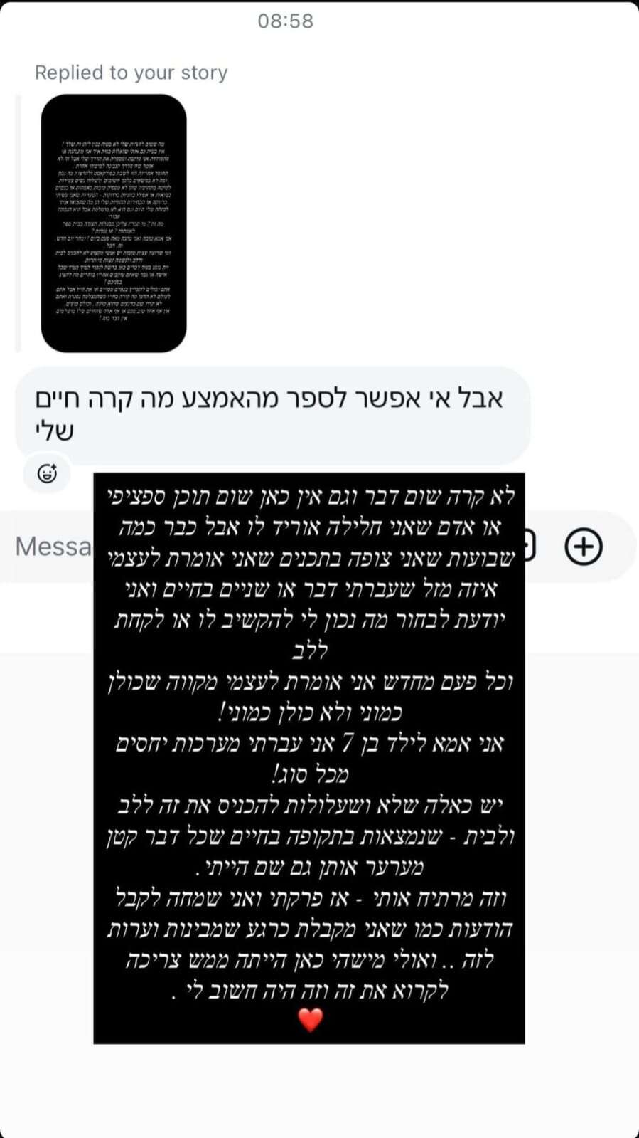 "לא קרה שום דבר וגם אין כאן שום תוכן ספציפי או אדם שאני חלילה אוריד לו", כתבה. "אבל כבר כמה שבועות שאני צופה בתכנים שאני אומרת לעצמי: 'איזה מזל שעברתי דבר או שניים בחיים ואני יודעת לבחור מה נכון לי להקשיב לו או לקחת ללב'. כל פעם מחדש אני אומרת לעצמי 'מקווה שכולן כמוני ולא כולן כמוני'. אני אימא לילד בן 7. אני עברתי מערכות יחסים מכל סוג. יש כאלו שלא ושעלולות להכניס את זה ללב ולבית. הייתי שם וזה מרתיח אותי - אז פרקתי, ואני שמחה לקבל הודעות כמו שאני מקבלת כרגע שמבינות וערות לזה. אולי מישהי כאן הייתה ממש צריכה לקרוא את זה וזה היה חשוב לי", סיכמה.