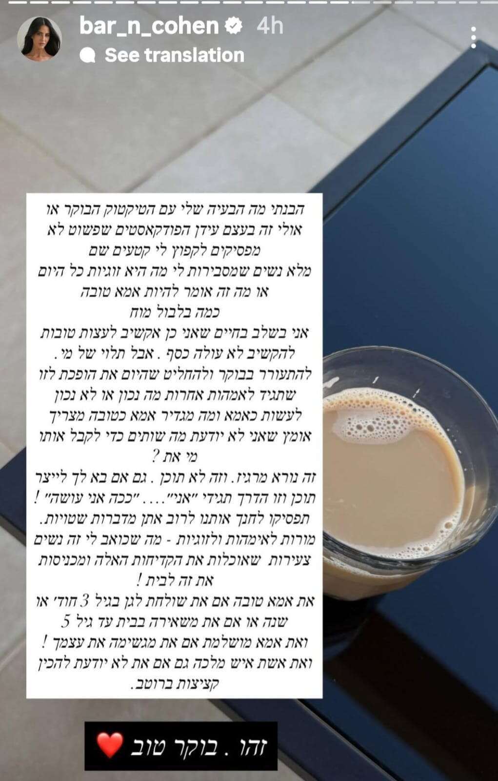 "לא להכניס לבית עצות מיותרות". הסטורי של בר כהן / אינסטגרם