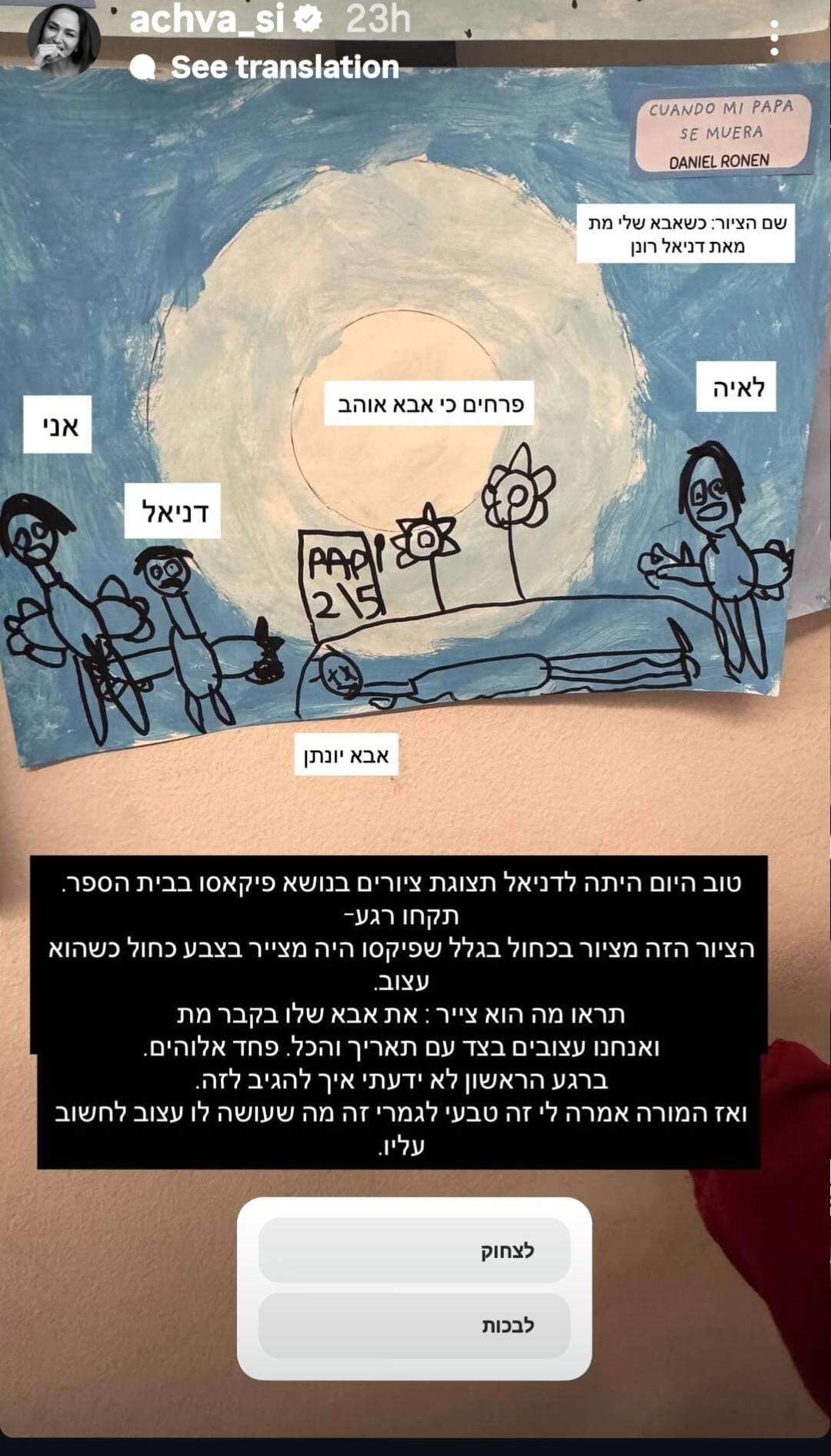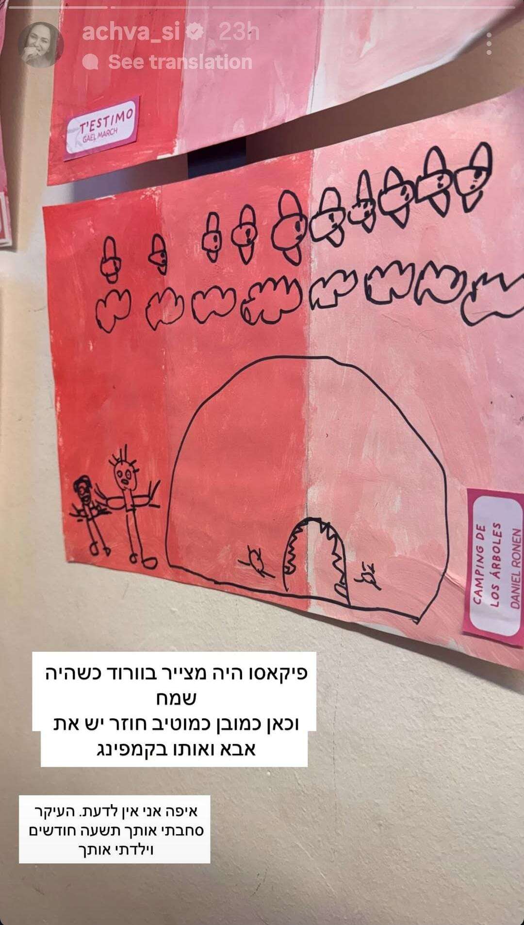 בסטורי נוסף, אחוה שיתפה בציור אחר שצייר דניאל באותו יום, שהפעם צויר בגוונים של ורוד. "פיקאסו היה מצייר בוורוד כשהיה שמח וכאן כמובן כמוטיב חוזר יש את אבא ואותו בקמפינג", כתבה ואז הוסיפה חצי בציניות: "איפה אני אין לדעת. העיקר סחבתי אותך תשעה חודשים וילדתי אותך".