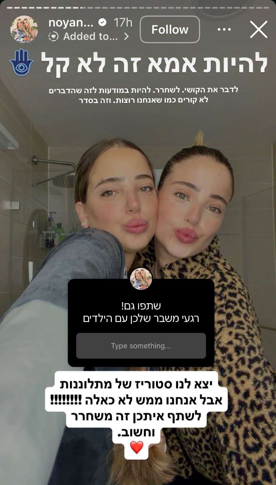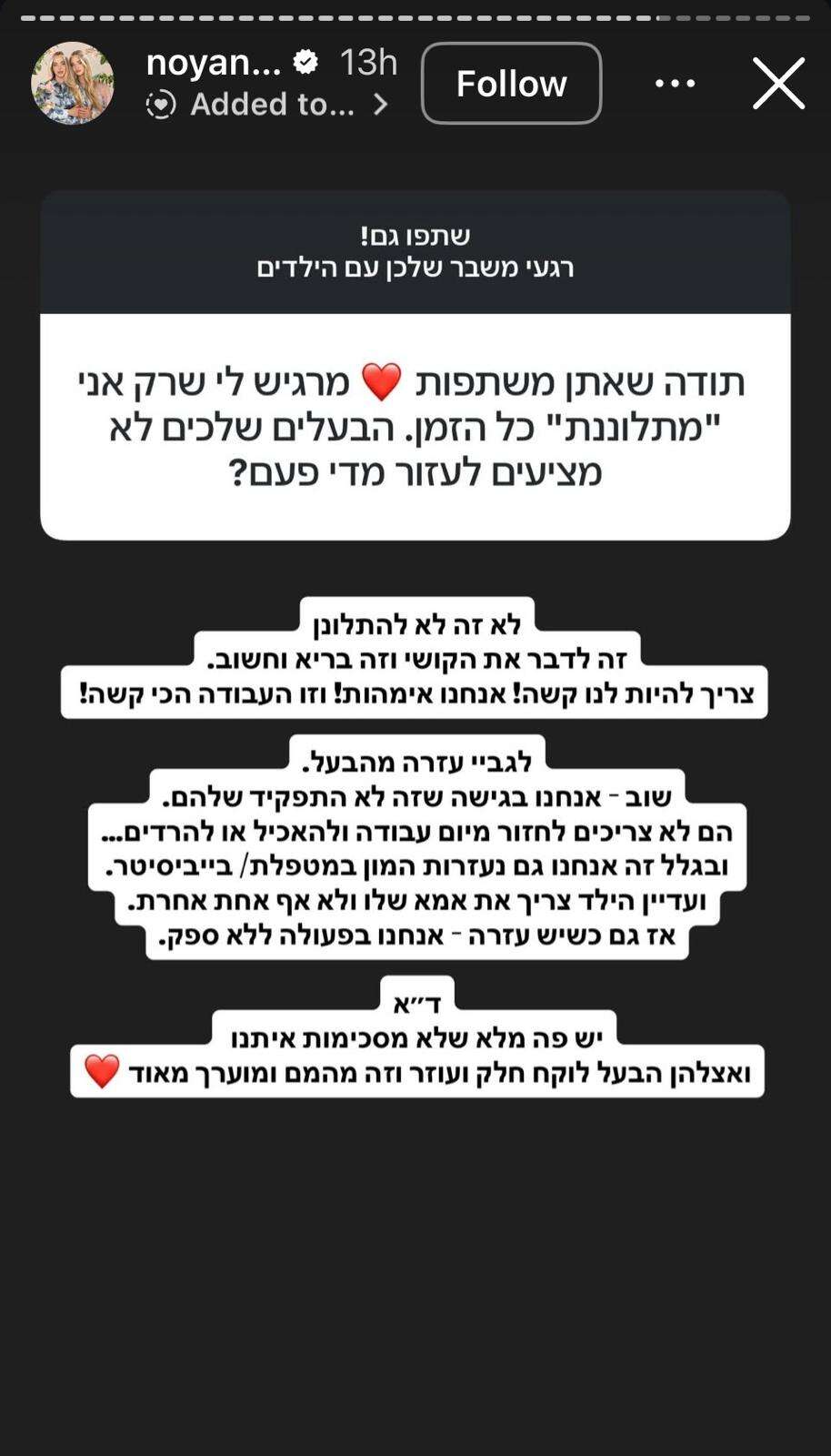 השתיים הוסיפו בסטורי אחר: "הם לא צריכים לחזור מיום עבודה ולהאכיל או להרדים... ובגלל זה אנחנו גם נעזרות המון במטפלת/ בייביסיטר. ועדיין הילד צריך את אמא שלו ולא אף אחת אחרת. אז גם כשיש עזרה - אנחנו בפעולה ללא ספק".