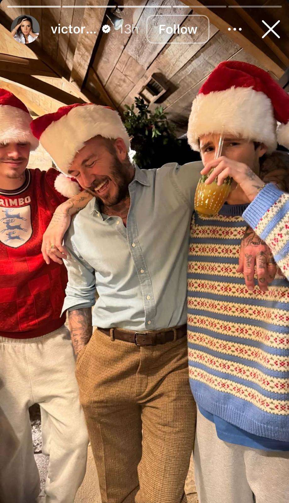 בתמונה שהעלתה לסטורי באינסטגרם ויקטוריה בקהאם, נראה דיוויד מחובק יחד בניו רומיאו וקרוז כשהם חובשים כובעי סנטה קלאוס. ויקטוריה אף שיתפה תמונה של בתה הארפר כותבת משאלות לצד עץ חג המולד ועוד סרטון ריל מושקע שבו נראה דיוויד חוטב עץ, מסדר ומקשט אותו עבור החג.