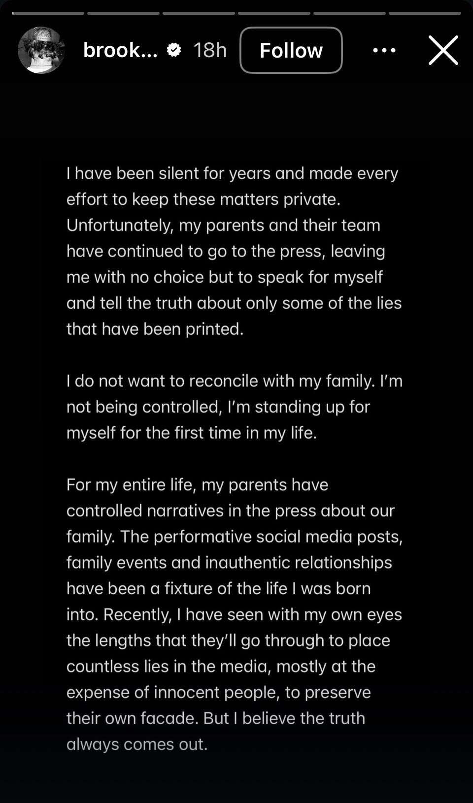עוד הוסיף ברוקלין כי הוריו לחצו עליו לחתום על ויתור זכויות לשמו, לחצו על אחיו לתקוף אותו ברשתות החברתיות ודאגו להפיץ שקרים נבזיים על ניקולה כולל ההאשמה שהיא שולטת בו.