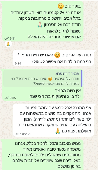 "מתנצל, אבל עם עומס הפניות אני מתמקד במשפחות עם ילדים גדולים יותר מחשש לדירה. בהצלחה", כתב להם בעל הנכס.
