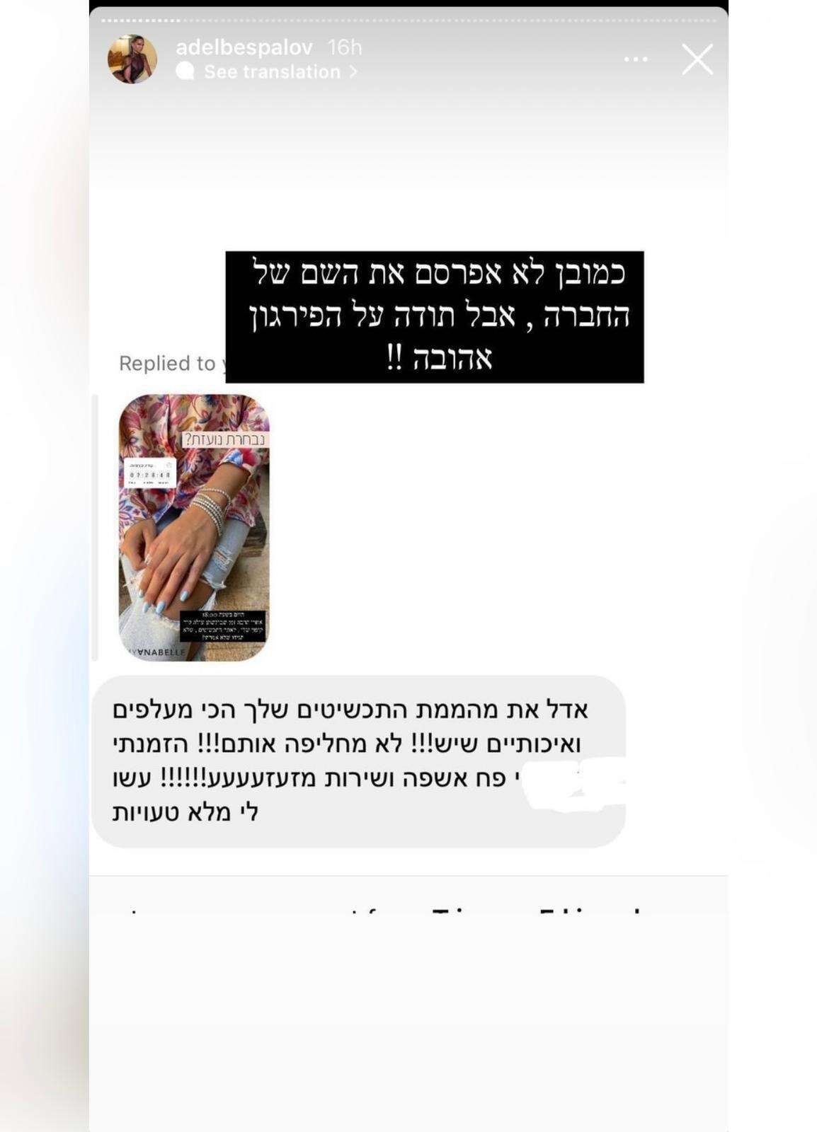 סכסוך חדש בביצה, רק שהפעם מדובר בריב על רקע מקצועי. אדל בספלוב העלתה אתמול (שבת) הודעה פרטית שקיבלה באינסטגרם, ובה נכתבו הדברים הבאים: "אדל, את מהממת והתכשיטים שלך הכי מעלפים ואיכותיים שיש. הזמנתי מ.. וזה היה פח אשפה ושירות מזעזע״.