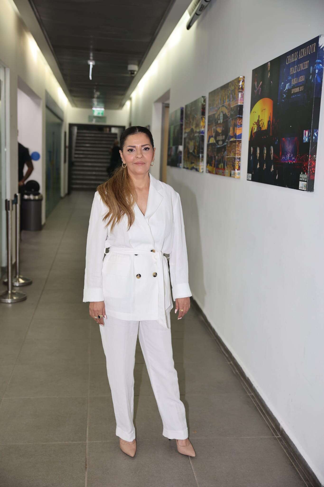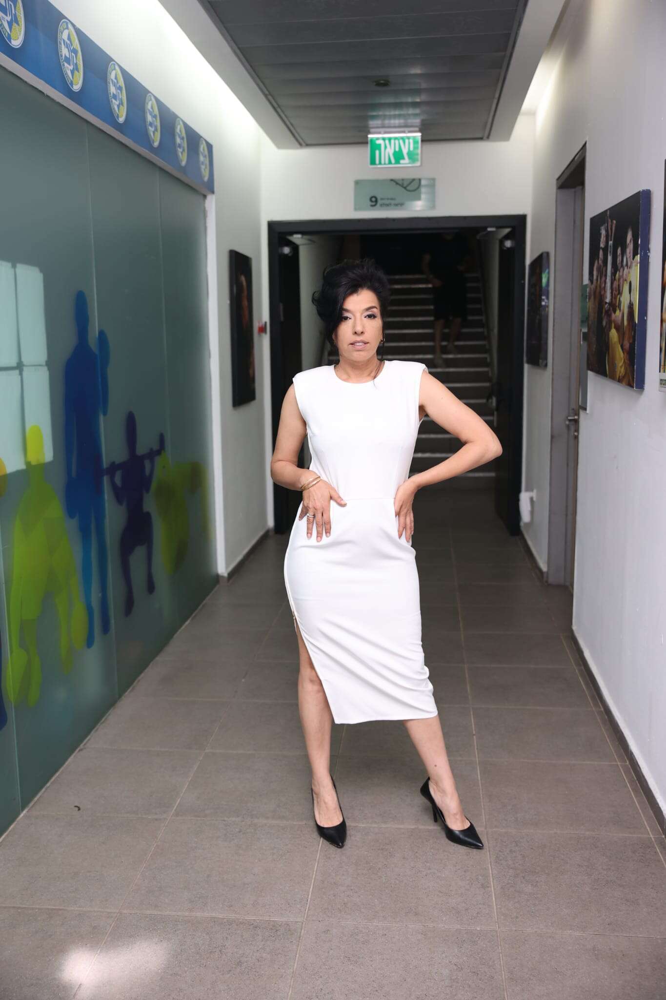 זהבה בן נראית מדהים בחליפה לבנה בעלת כפתרה כפולה וחגורת קשירה באזור המותניים בשילוב עם עקבים בצבע ניוד.