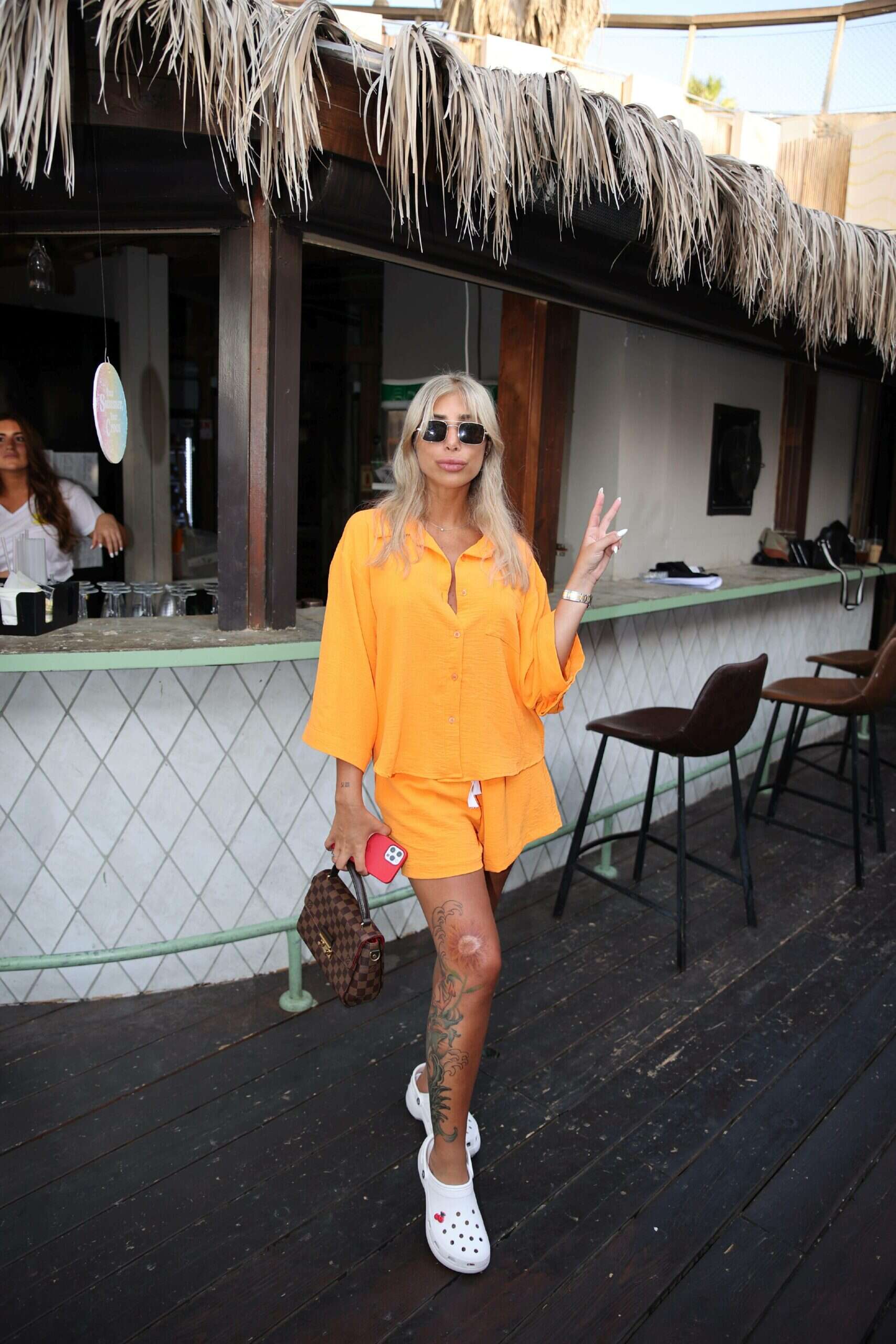 עוד בלטה לטובה מעיין אשכנזי, שלבשה חליפה טרנדית כתומה שכוללת מכנסיים קצרצרים וחולצה מכופתרת עם שרוולי 7/8 של טוונטי סיקס, תיק צד חום של לואי ויטון וקרוקס לבנות.