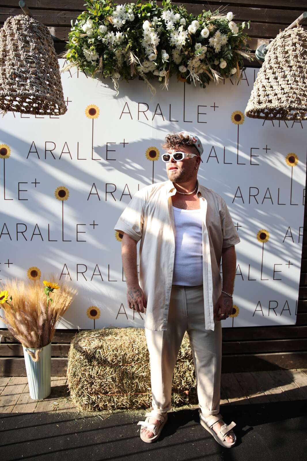 אוראל אלוש בן שלום נראה מעולה בהשקת המותג שלו "ארל'ה פלוס". הוא לבש טוטאל לוק בהיר שכולל מכנסיים מחויטים בצבע בז', חולצה מכופתרת פתוחה בצבע זהה וסנדלים באותו צבע. הוא שילב את האאוטפיט עם גופיה לבנה, שרשרת פנינים, משקפי שמש מוגזמים עם מסגרת לבנה ועיטורי זהב וכובע תכלת.