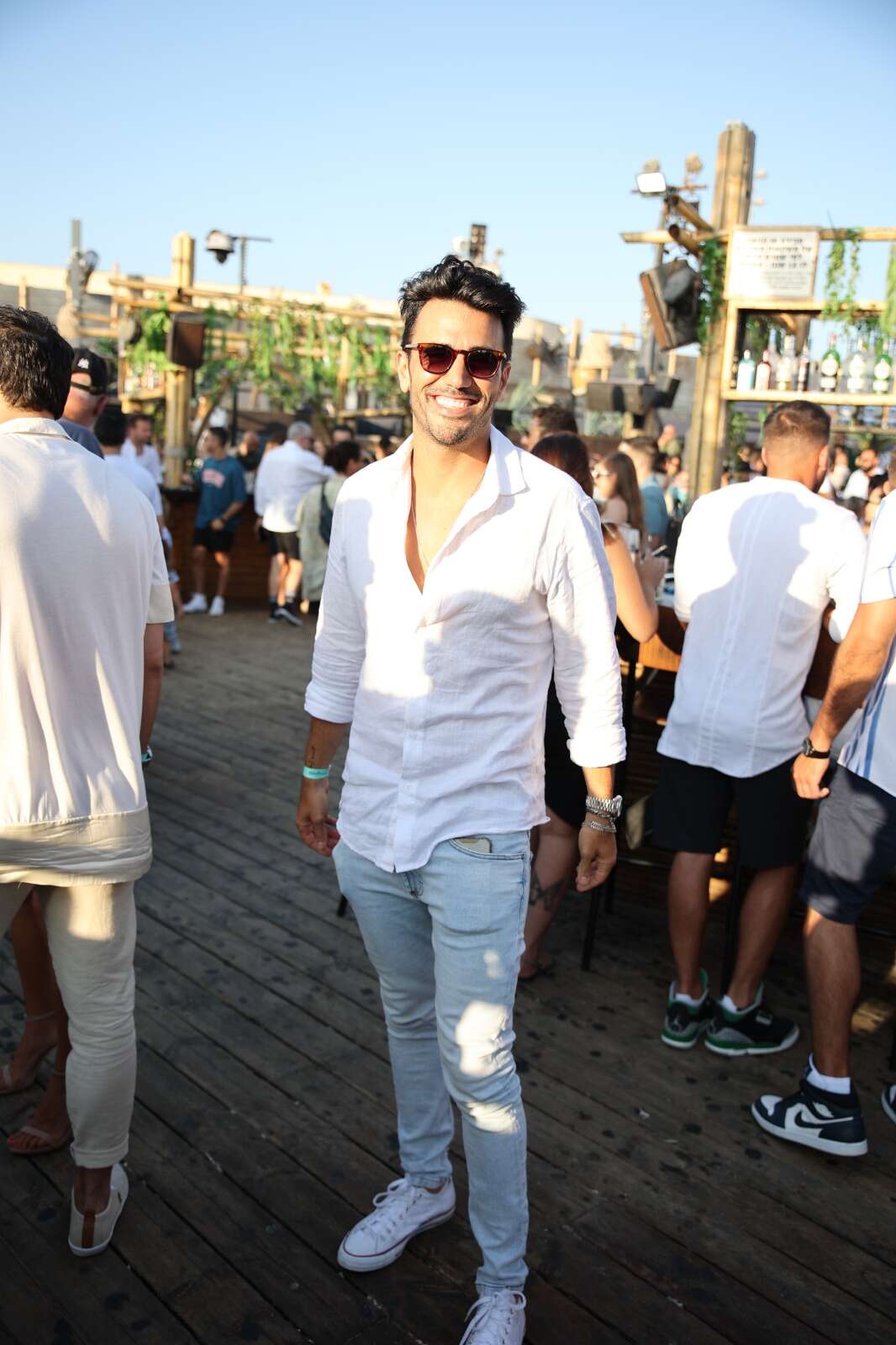 תום חיימוב שומר על המעמד הסטייליסטי שלו, וגם הפעם הוא נצפה בג'ינס סקיני בצבע תכלת בשילוב עם חולצה מכופתרת לבנה, סניקרס לבנות ומשקפי שמש חומים. פלטת צבעים קיצית ונכונה לעונה.