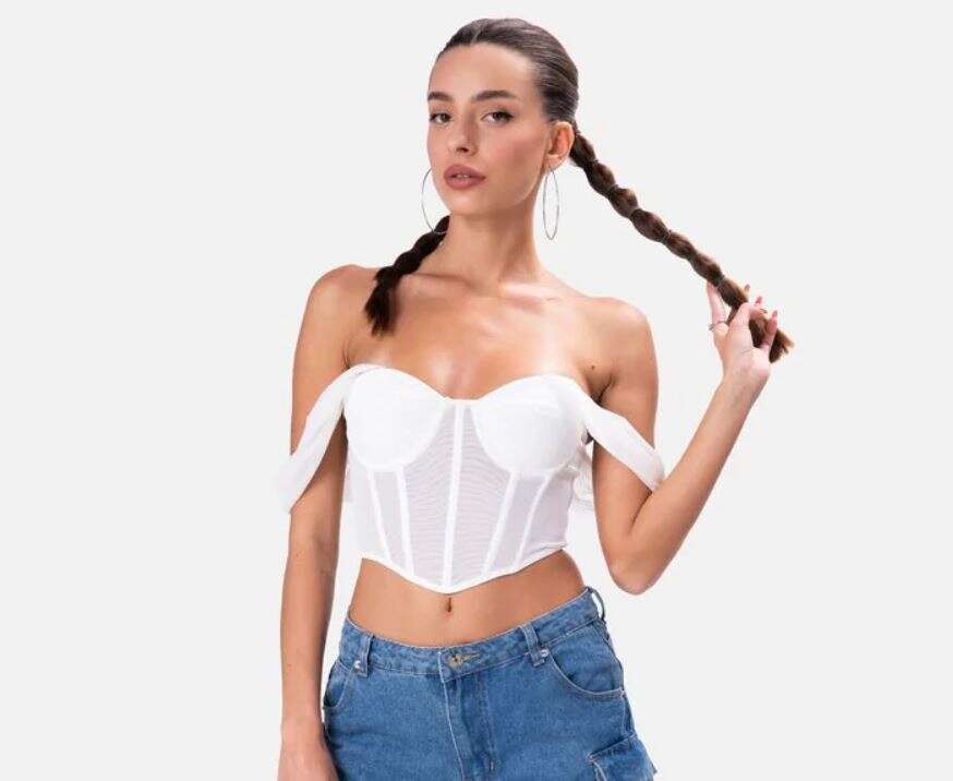 הגרסה הרומנטית: מחוך בעל כתפיות נופלות במראה נסיכותי. המחוך ללא שקיפויות ויכול להתאים לטוטאל לוק אלגנטי לאירוע ערב. הגזרה משדרת מראה קשיח ומוחזק, אך הכתפיות מרככות את הטוטאל לוק. מתאימה לנשים שעפות על הטרנד ורוצות לאמץ אותו במקסימום.