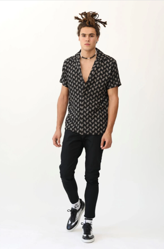 מעצב האופנה מעוז דהאן, בעל המותג "נובוריש דוג" מעצב לגברים ולנשים, אך מתמחה בהלבשת חתנים, ונוהג לשלב בכל קולקציה חולצות מכופתרות עם הדפסים מגוונים. אהבנו במיוחד חולצה מכופתרת שחורה עם הדפס