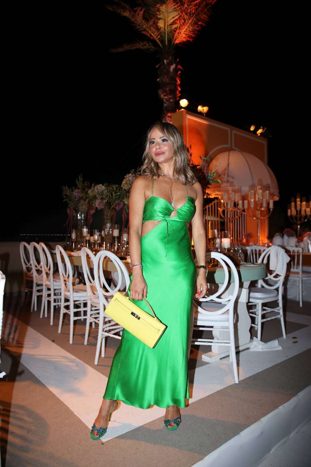 אירית רחמים הגיעה בצבעוניות שאנחנו מאוד אוהבים שכוללת ירוק בהיר, צהוב בננה ותכלת ים, עד כאן הכל טוב. גם האורך של השמלה מאוד מחמיא לה, אך הגזרה של הקאט־אאוטים מתחת לחזה ובמרכז החזה מעט טו מאץ' מבחינתנו, והיינו מסתפקים בקאט אאוט אחד למראה יותר קלאסי. עם זאת, על התיק עפנו ברמות.