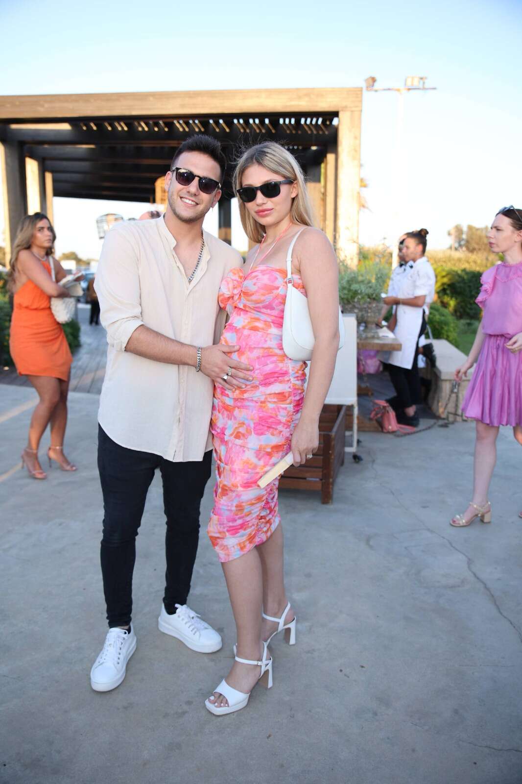 הזוג המאוהב קווין רובין ודניאלה קריסטה הגיעו קצת לעודד את רוחנו בטוטאל לוק זוגי קיצי ומושלם. קריסטה בשמלה פרחונית בצבעים של קץ בשילוב עקבים לבנים ותיק יד לבן, ורובין בסקיני שחור, סניקרס לבנות וחולצה מכופתרת אוברסייז.
