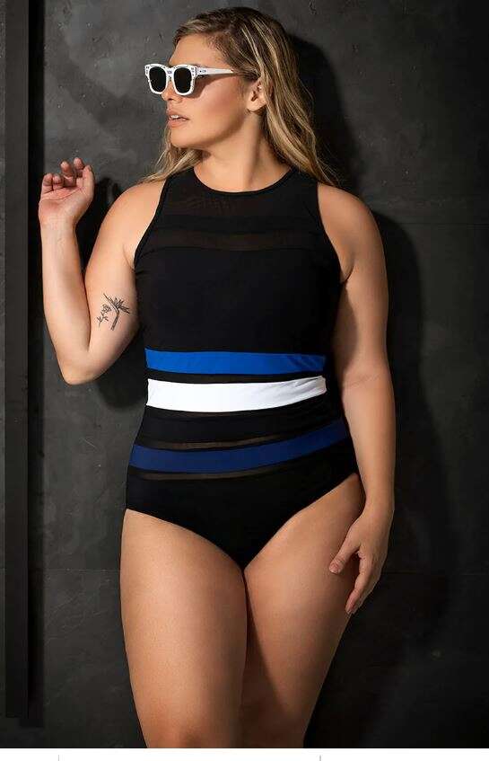 הספורטיביות: MORENA מציעים בגד ים שלם בצבע שחור עם פסים רוחביים בכחול ולבן עם רשת וצווארון גבוה שמגיע גם במידות גדולות. בחלקו הפנימי של בגד הים מחטב איטלקי איכותי בשילוב חכם של עיצוב חיצוני עם בטנה מחטבת אטומה למניעת שקיפות.
