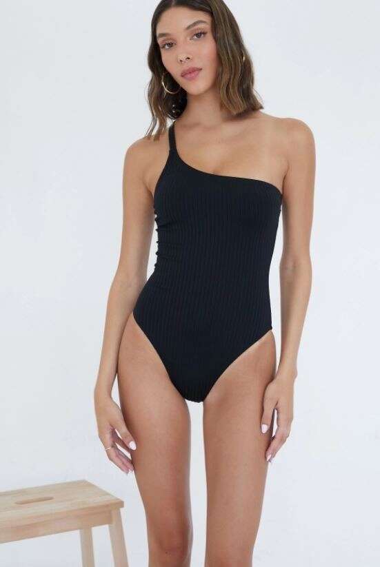 הטרנדיות: טוונטיפורסבן מציעים בגד ים שלם א-סימטרי בצבע שחור בגזרת וואן שולדר עם טקסטורת ריב וכתפייה דקה מתכווננת.