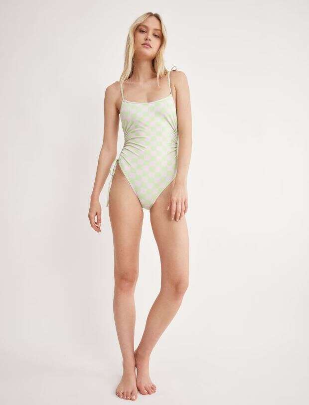 המתוחכמות: קסטרו מציעים בגד ים שלם עם הדפס משבצות בגוונים של ירוק ליים ולבן. כתפיות קשירה וכיווצים בצדדים שניתנים להתאמה לפי הגזרה של כל אחת.