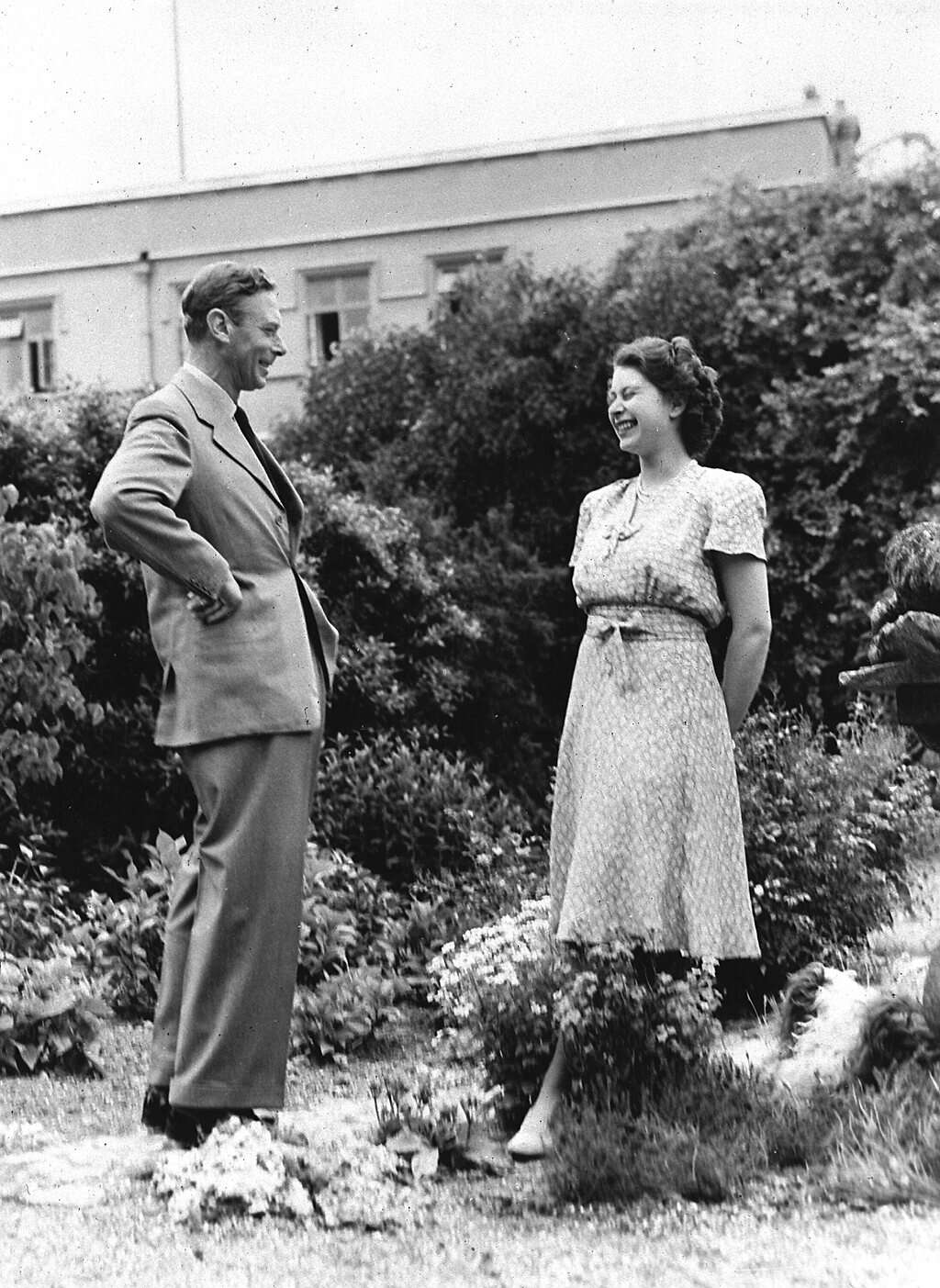 המלכה אליזבת לובשת שמלה אופנתית, עם גזרה מחמיאה וקשירה במותניים. צוחקת עם אביה המלך ג'ורג' השישי, בשטח הטירה בווינדזור. 20 באוגוסט 1946. צילום: אי.פי