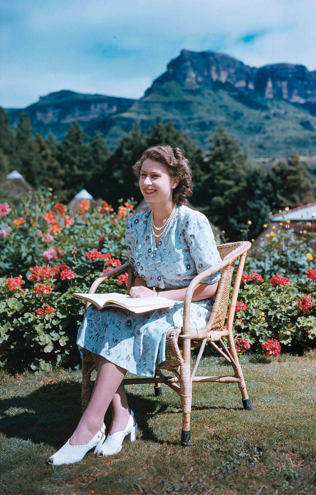 המלכה אליזבת ביום הולדתה ה-21, 1947 בדרום אפריקה. בשמלה קלילה עם הדפס עדין, שרשרת פנינים והגרסה המוקדמת לעקבים עם סיומת שפיץ. צילום: אי.פי