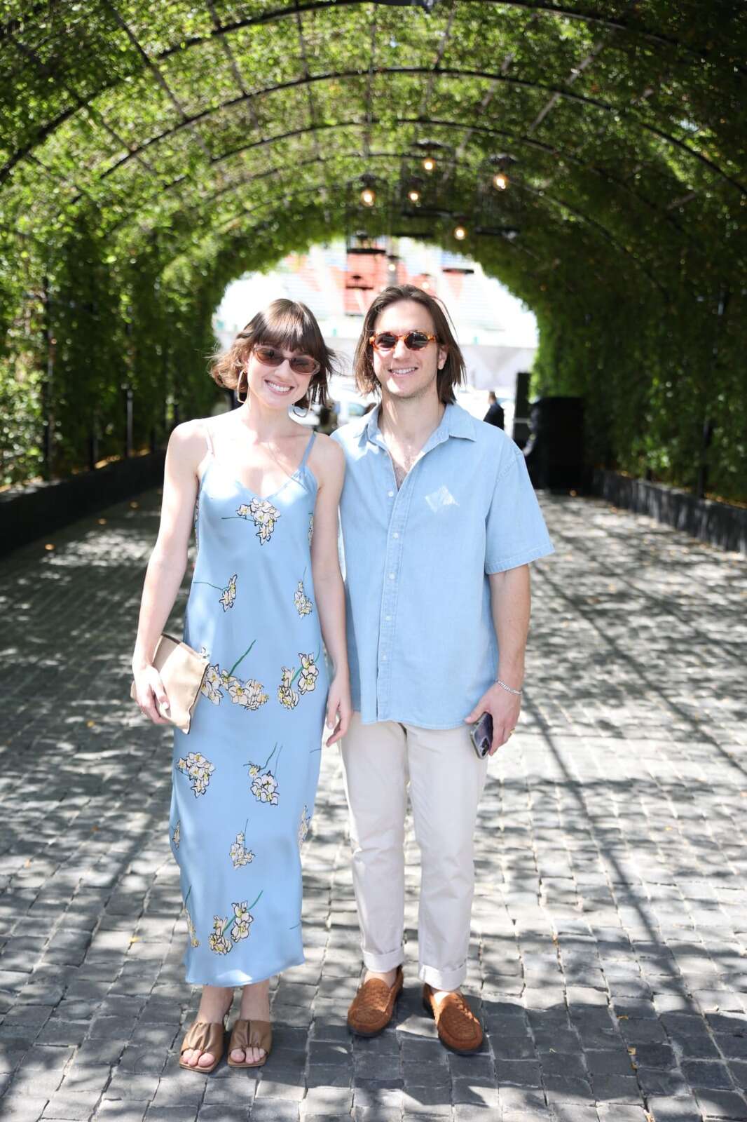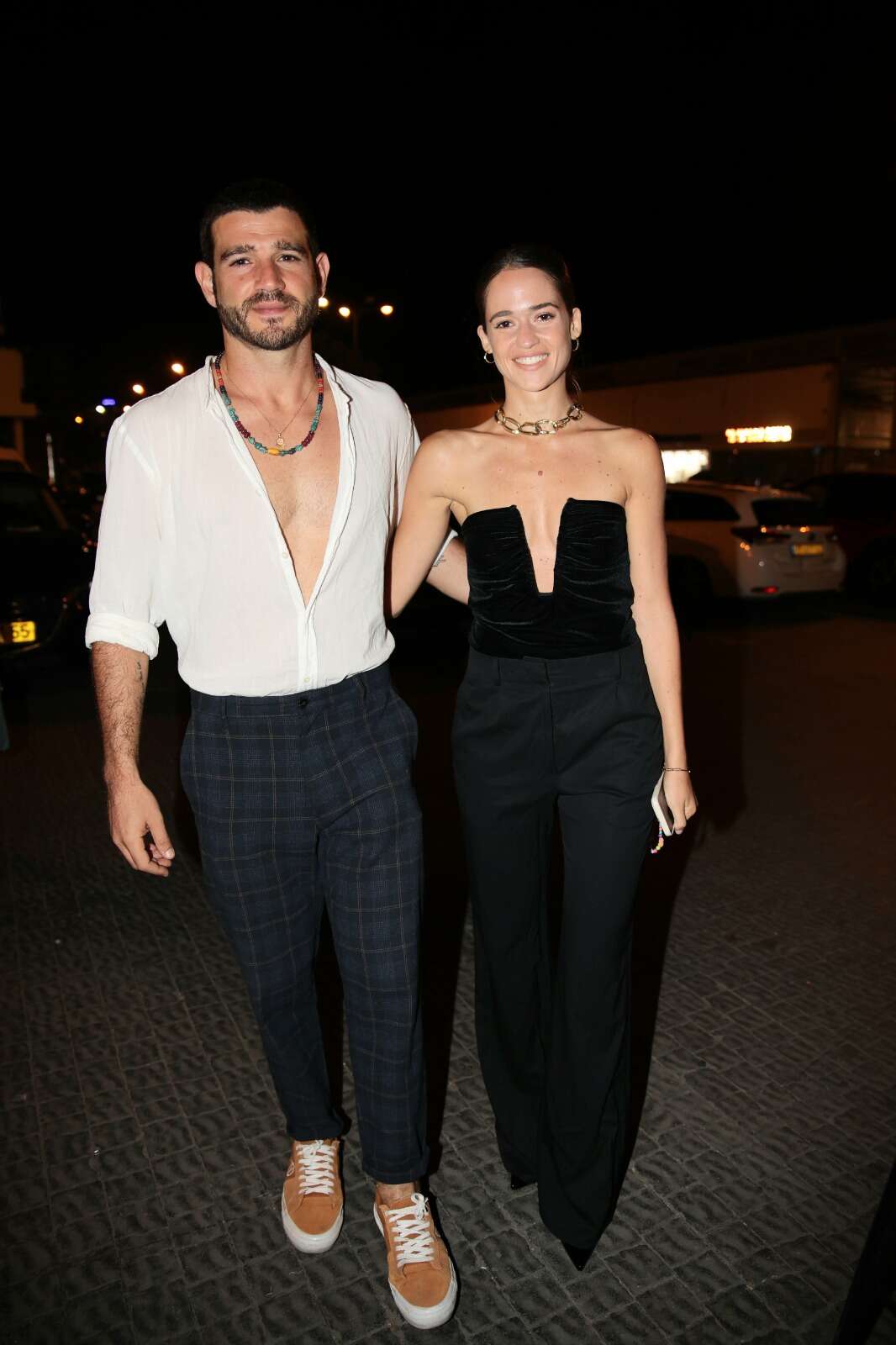 בני הזוג לי בירן ואליענה תדהר נראים מצוין בטוטאל לוקים מתואמים בצבעוניות מדויקת. בירן במכנסי בז' מחויטים בשילוב חולצה מכופתרת בצבע תכלת ונעלי מוקסין חומים, ותדהר בשמלת מקסי תכלת עם הדפסי פרחים, תיק קלאץ' וכפכפים חומים מעוצבים.