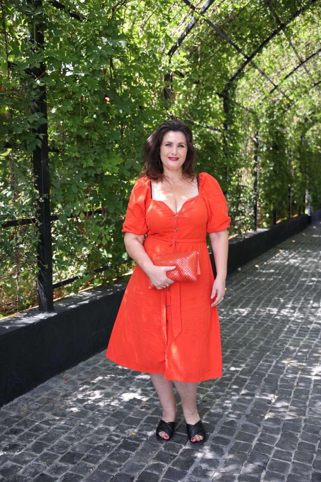 השחקנית עירית קפלן נראית וואו בשמלה בצבע כתום עם מחשוף לב, שרוולים תפוחים, כפתרה קדמית וחגורה שמדגישה את המותניים, בשילוב עם תיק קלאץ' תואם. על הכפכפים השחורים היינו מוותרים, ובמקומם בוחרים ללכת על צבע ניוד או חום שיחיה בהרמוניות לצד השמלה.