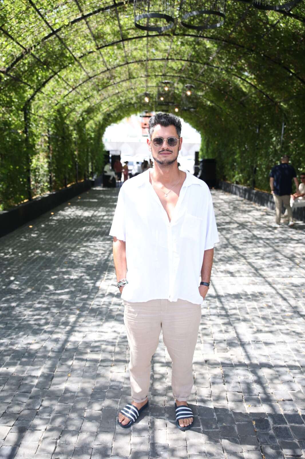גם השחקן עופר חיון נראה מדהים והגיע בדיוק כמו שצריך לחתונת בריכה, מכנסיים חצי מחויטים בצבע בז', בשילוב חולצת אוברסייז לבנה מכופתרת וכפכפים בגוונים של נייבי ולבן.