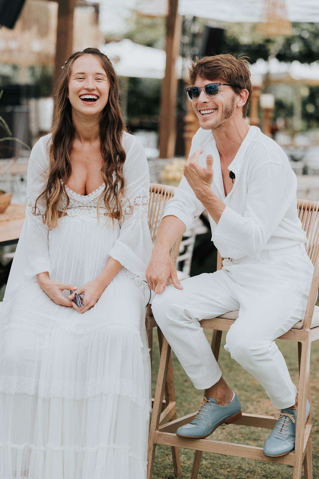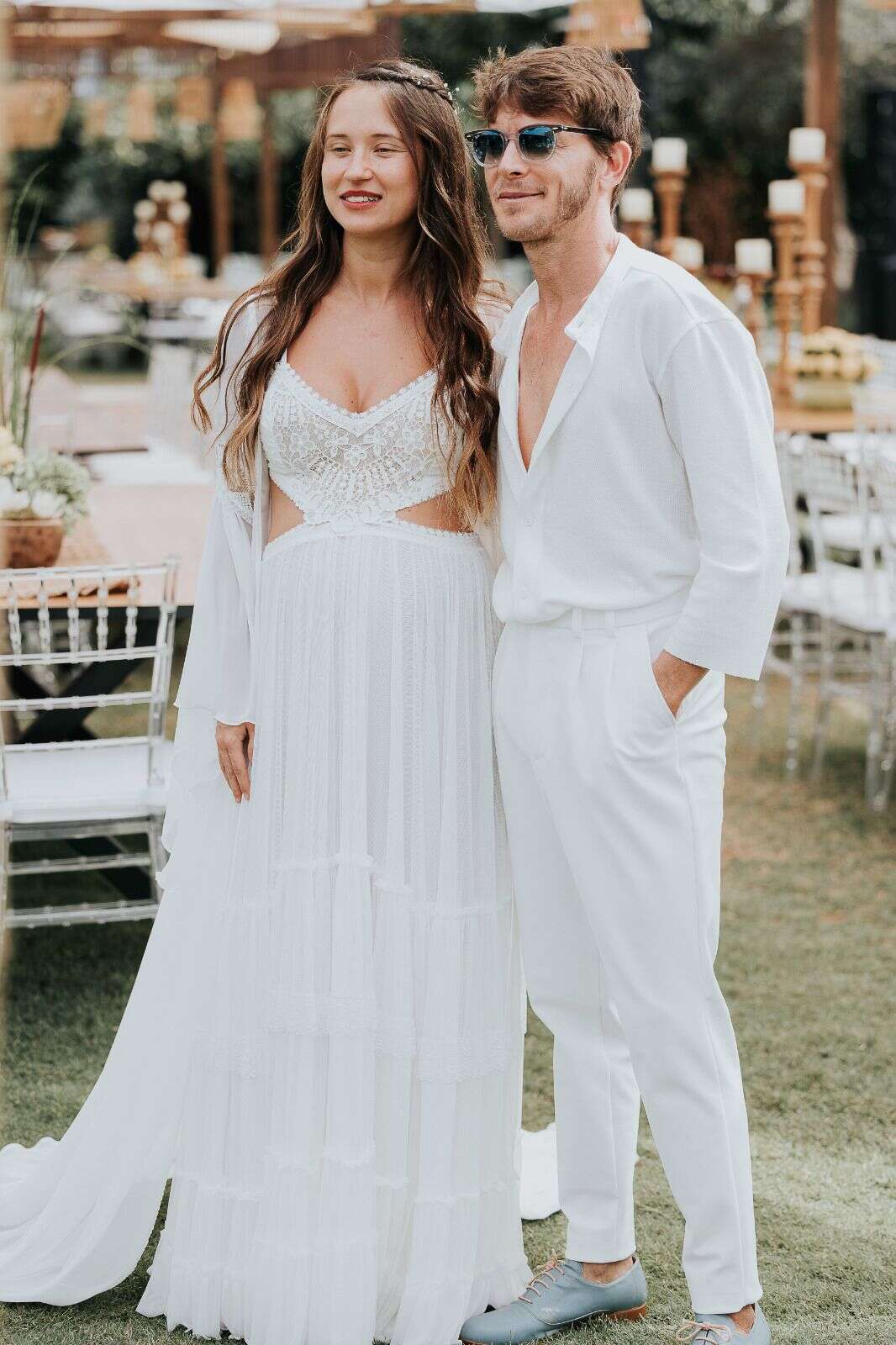 שכטר וגיל נראו מדהים בלבן. שכטר בחר בחולצה לבנה מכופתרת עם מחשוף עמוק, בשילוב מכנסיים לבנים מחויטים בגזרת סקיני ונעליים אלגנטיות. גיל בחרה בשמלת כלה קלילה עם קאט אאוטים טרנדיים בצדי הבטן וכתפיות דקות, עליהם היא הוסיפה עליונית לבנה.