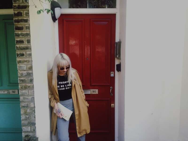 מעיל מ AMRERICAN VINTAGE, חולצת טי שרט מH&m, מכנסיים UNICQLO,  משקפי שמש מקרולינה למקה // צילום: דיאנה לויט