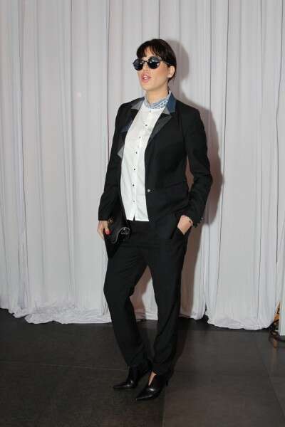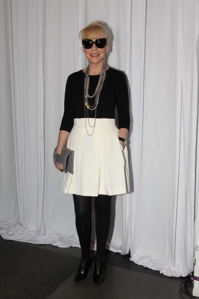 גילת אנקורי. הו, גילת אנקורי. עוד אישה שרק משתבחת עם השנים. ראיתי אותה מקפצת בין השלוליות במגרש החניה בתום התצוגה, הגב שלה היה מופנה אלי והייתי בטוחה שמדובר בנערה בת 16. אנקורי היא אישה ללא גיל שנדמה שמצעירה עם השנים, ויודעת לבחור מראות לבוש שמשקפים את הרוח הצעירה מבלי לצאת פתטית. גם פה ההצלחה ניכרת: החצאית הלבנה בגזרת הקפלים משווה לה מראה שובב, החולצה השחורה, הגרביונים האטומים והקלאץ' מוסיפים את הטאץ' הקלאסי הנדרש לאישה בגילה ובמעמדה. משקפי השמש השחורים מוסיפים אטיטיוד ומשלימים הופע קולית אך מודעת לעצמה.