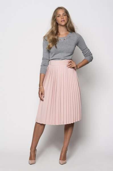 אופציה נהדרת - חצאית מידי בגזרת A בשילוב נעלי עקב נמוכות וסריג קטן.