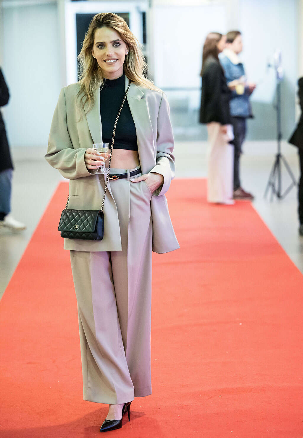רותם סלע נראתה מדהים בחליפה מחויטת בצבע אפור בהיר, שכוללת מכנסיים רחבים בגזרה גבוהה, בשילוב חגורה דקה וז'קט מחויט ארוך. מתחתיו היא הוסיפה טופ שחור, וצירפה תיק צד שחור עם רצועת שרשרת, ונעלי עקב שפיץ. הצבעוניות שסלע בחרה מדויקת, הגזרות נכונות ומחמיאות, ומרענן לראות אותה באירוע חגיגי עם חליפה ולא עם שמלה קטנה וצמודה.
