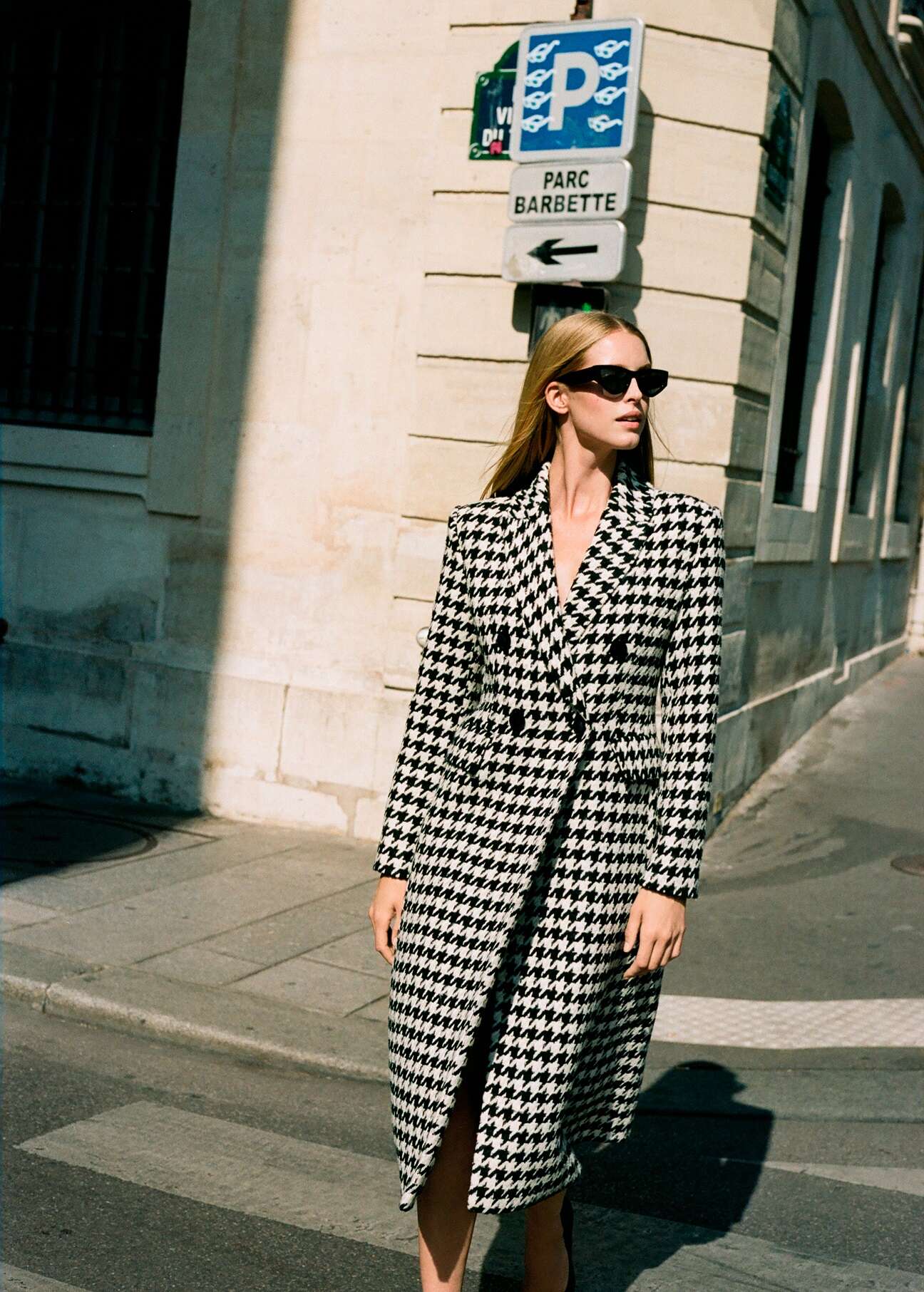 נתחיל ממעיל פפיטה בגזרה מחויטת. אנחנו ממליצים לבחור באחד שעובר את אורך הברכיים, ועם כפתרה כפולה. החוכמה עם ההדפס הזה היא לשלב רק פריטים שחורים - נעליים, תיק, משקפי שמש, ולא לשלב עוד פריט שמגיע בשחור ולבן. ההצלחה היא באורכים הנכונים שמחמיאים לטוטאל לוק.