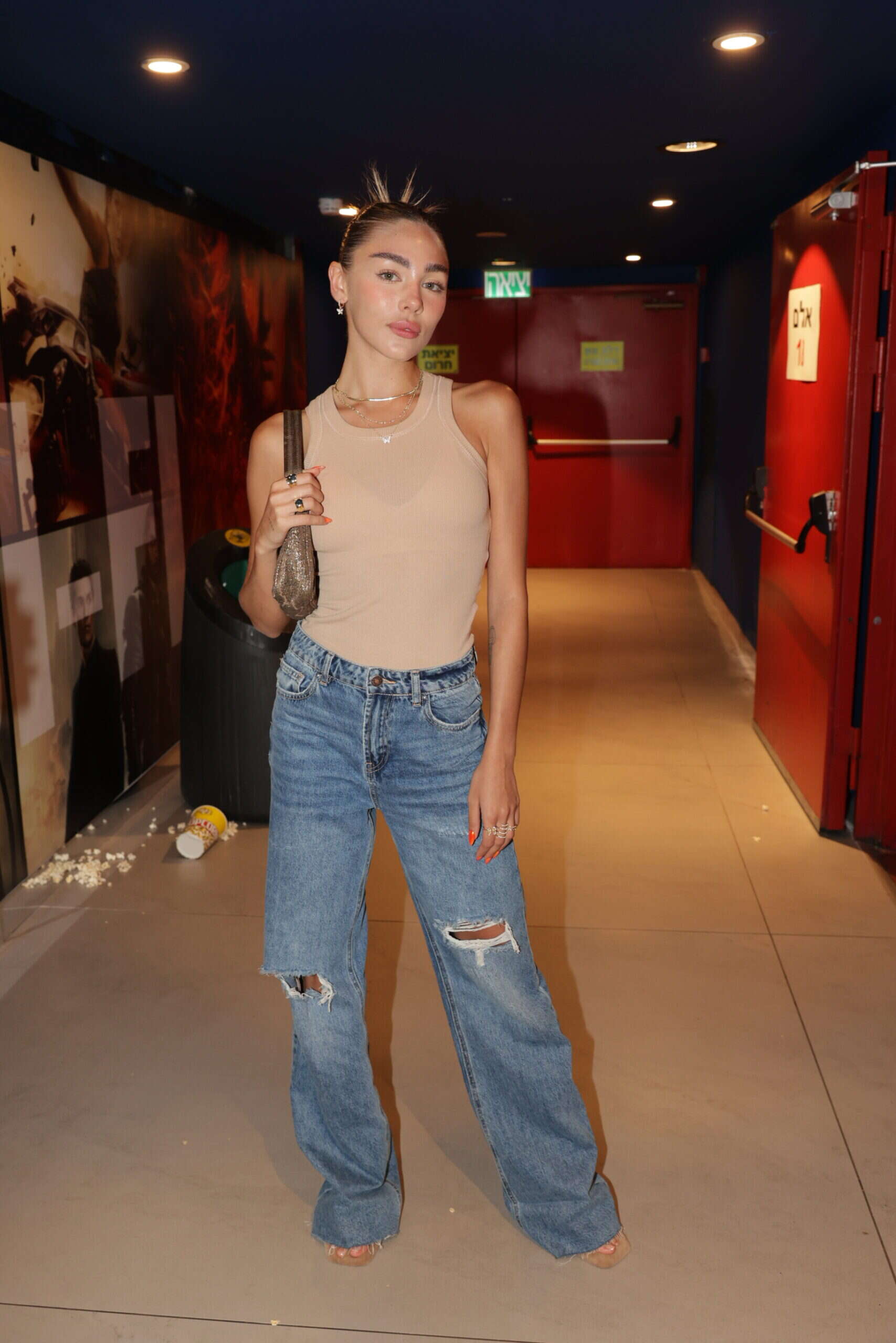 מאיה קיי במראה שאי אפשר ממש לטעות איתו - אבל גם לא להעז איתו. גופייה צמודה בצבע פודרה וג'ינס בהיר משופשף ורחב עם קרעים בברכיים: לא קר ולא לוהט.