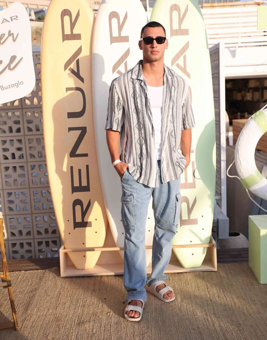 נתחיל מהזוג המלכותי, מירן ומאור בוזגלו שנראים נהדר. מאור בטישרט פסים אוברסייז בשילוב מכנסיים קצרים עד הברך בצבע אבן וסניקרס לבנות ומירן בסט ורוד פסטלי שכולל מכנסיים קצרים מחויטים, חולצה מכופתרת וחזיית בגד ים מבצבצת בשילוב סנדי קשירה עם שפע חוטים. אהבנו מאוד את הצבעוניות ואת ההתאמה בין השניים, ממליצים לכל הקוראים והקוראות לאמץ.