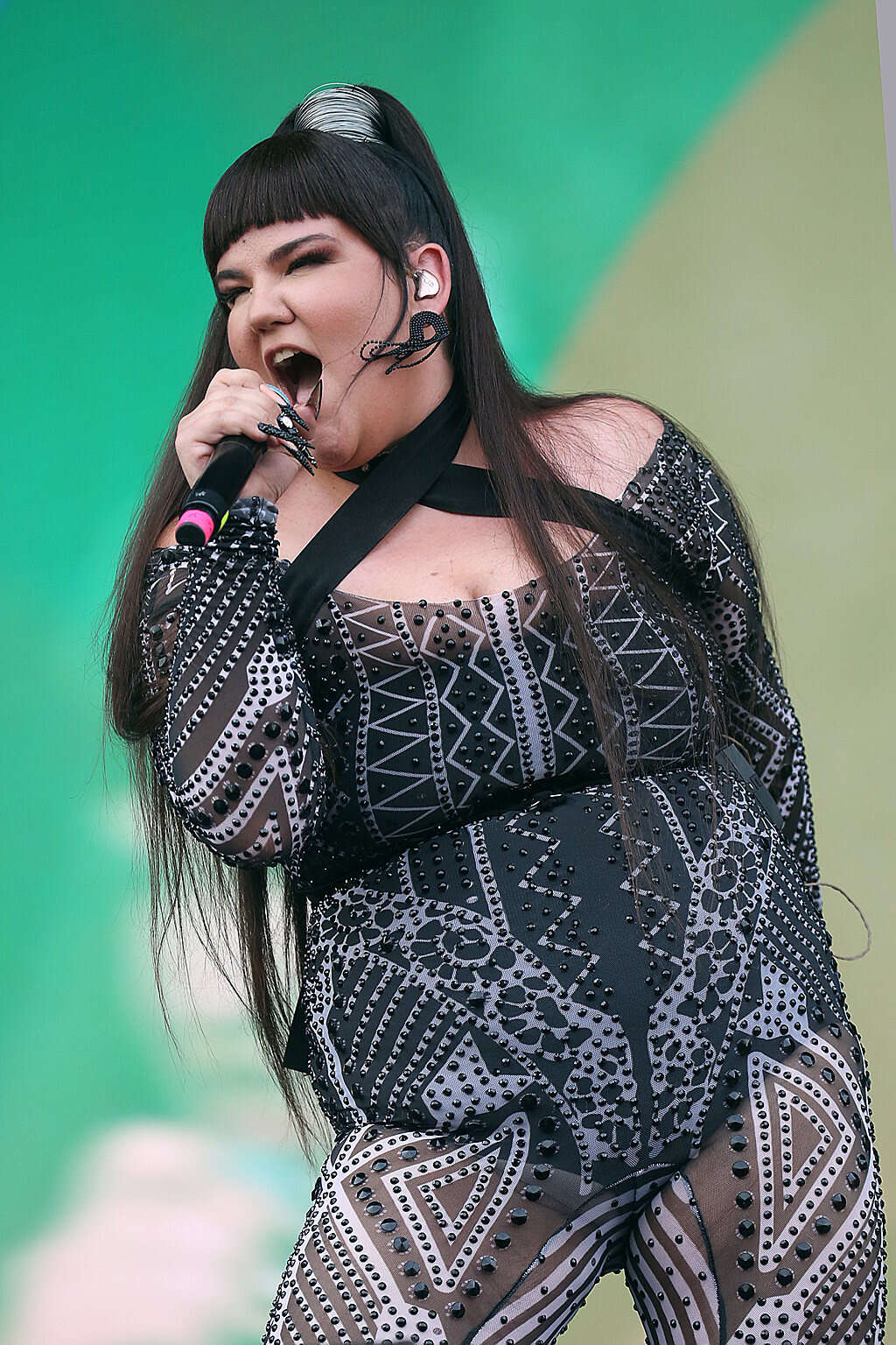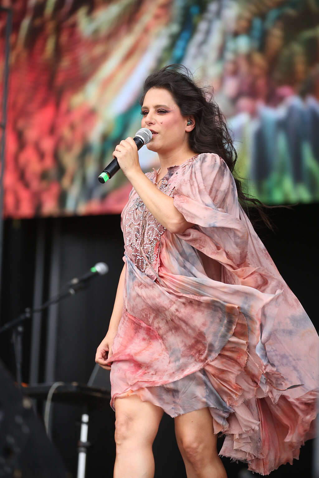 הזמרת נונו הגיעה אתמול (שישי) למסיבת הגאווה הגדולה בפארק הירקון והדהימה את הקהל בשמלת מצופים בצבע כתום, אליה התאימה קשת של מצופים מנופלים על ראשה.