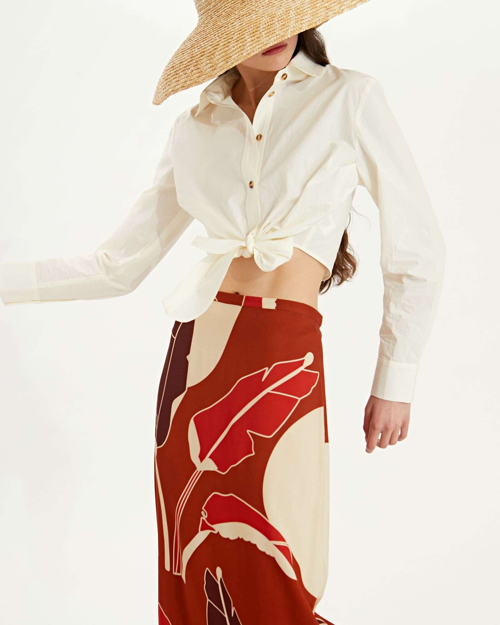 חצאיות עם אמירה: שילוב של חולצה לבנה עם חצאית בעלת נוכחות, כמו חצאית מקסי בהדפס פרחוני או חצאית מידי מטאלית עם קפלים, יוצר ניגוד מעניין בין פשטות החולצה לחצאית המושכת את העין. שילוב זה מושלם לאירועים רשמיים או לאירועים הדורשים מגע של זוהר.