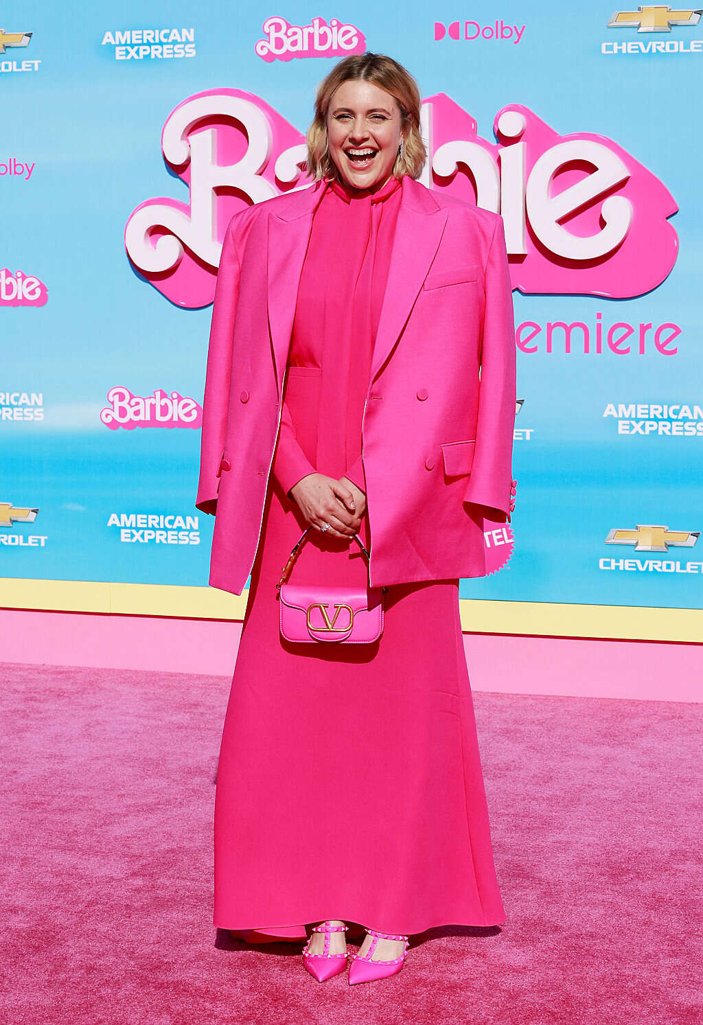 גם במאית הסרט גרטה גרוויג הגיעה בלוק ורוד בשמלה ארוכה ומתנפנפת ובלייזר ורוד באותו הגוון שמונח מעליו.