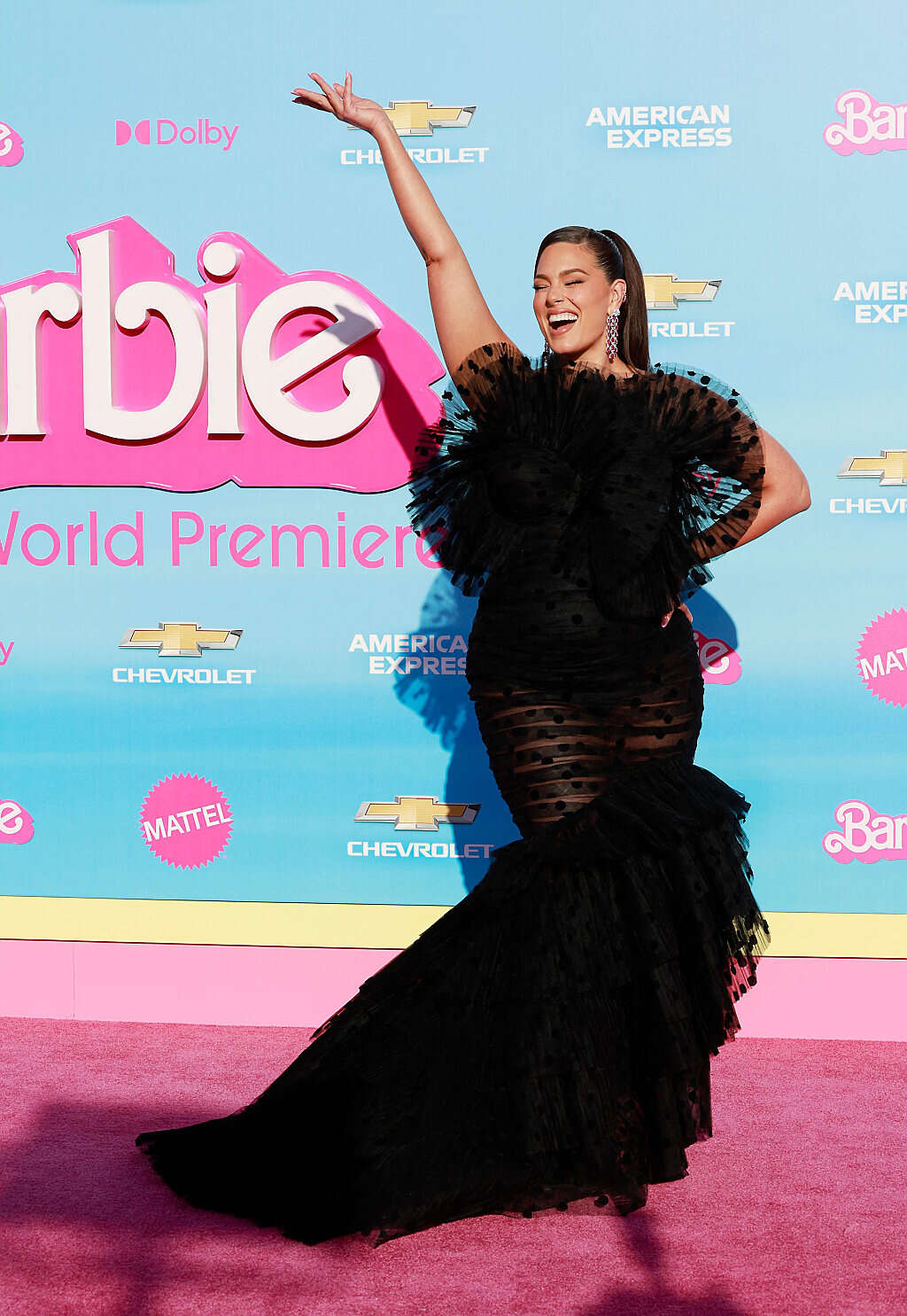 הדוגמנית אשלי גרהם נראתה מעולה בשמלה שובל ארוכה שהולכת הצידה בצבע שחור עם חלק עליון שמתכתב עם השובל התחתון.