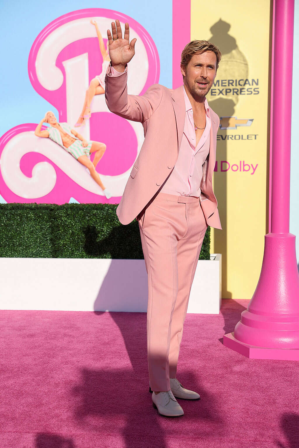 מהצד השני של השטיח הוורוד הגיח השחקן שמגלם את קן, ראיין גוסלינג, בחליפת ג'וצי פסטלית ונעליים בצבע לבן.