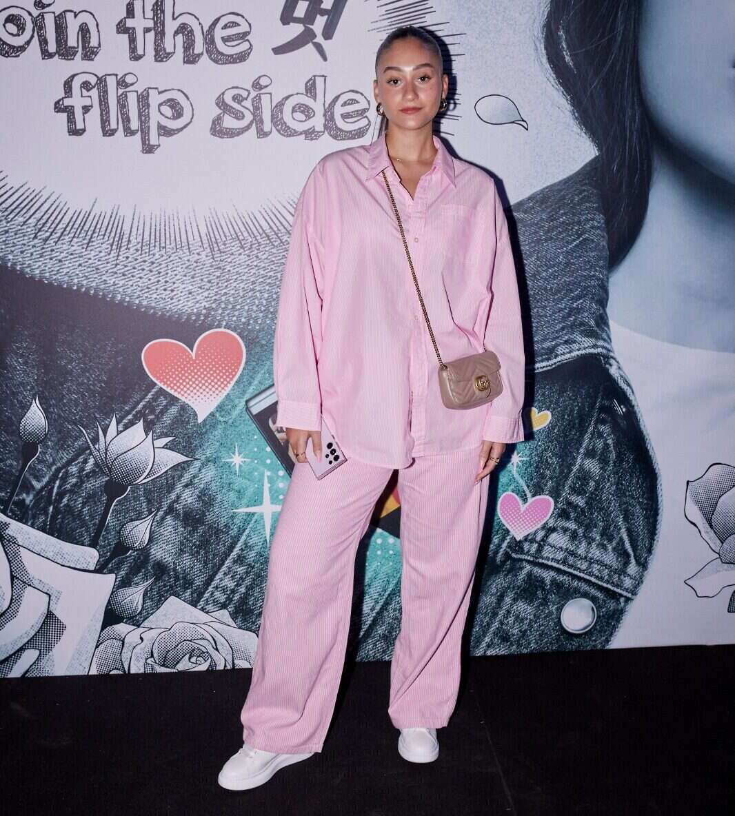 אגם בוחבוט לבשה סט ורוד בייבי שכולל מכנסיים רחבים וחולצה מכופתרת אוברסייז בשילוב תיק קטן מהמם בצבע פודרה וסניקרס לבנות. הסט היה רחב מדי לטעמנו, ואין לנו ספק שאם אחד משני הפריטים היה פחות אוברסייז, הלוק היה הרבה יותר מאוזן ופחות פיג'מתי.