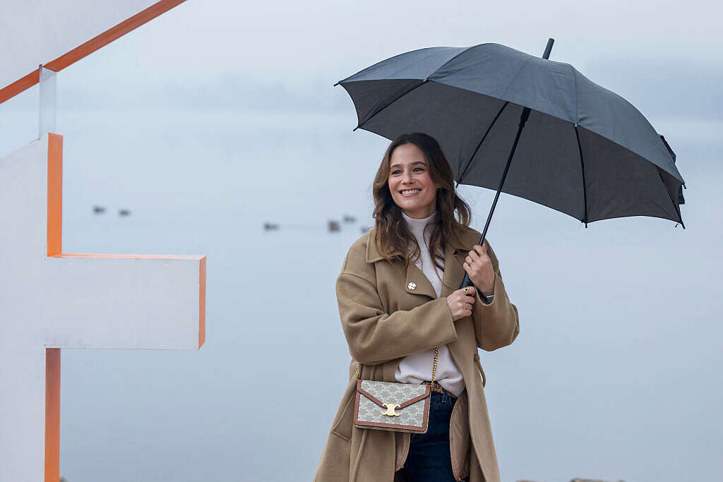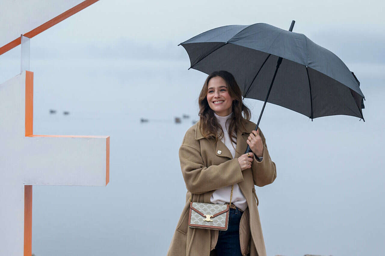 השחקנית מלאני ברנייה במטריה שחורה ושיק צרפתי. צילום: AFP