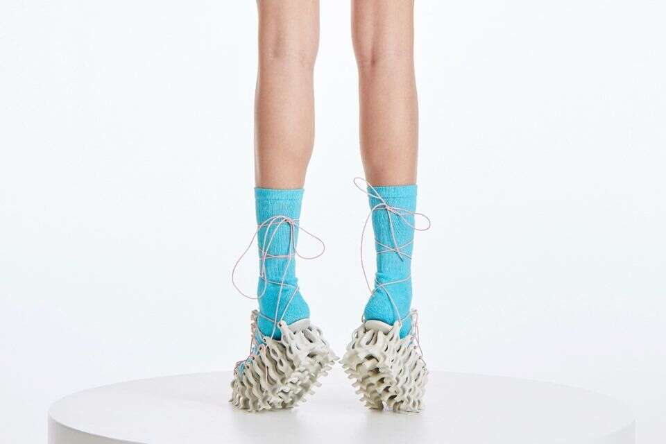 מעין גולדברג הציגה חדשנות מרשימה עם שני דגמים בפרויקט "Echoes of Humanity", המשקף את המתח שבין האנושי למלאכותי בעידן הבינה המלאכותית. נעליה, המודפסות בתלת-ממד, משלבות מחברים אנטומיים היוצרים תחושת חוסר יציבות מכוונת.