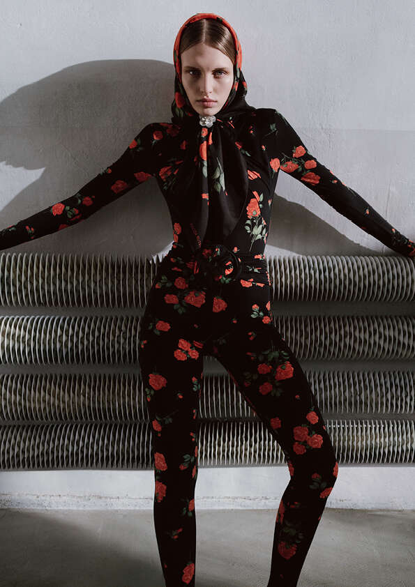 מכנסי ג'ינס רפויים משתלבים היטב עם חולצת מחוך מחוטבת מג'ינס בעלת ניצני פרחים בחזה או טופ ורוד מסטיק בעל מחשוף עמוק. לצד אלה אפשר למצוא מטפחת סרוגה בהשראת מלאכת יד סלאבית מסורתית שיכולה להיקשר מתחת לסנטר או בעורף, מטפחת קשירה בעלת הדפס של ורדים וגם גרביונים שחורים משולבים בוורד בחלק האחורי של הרגל.