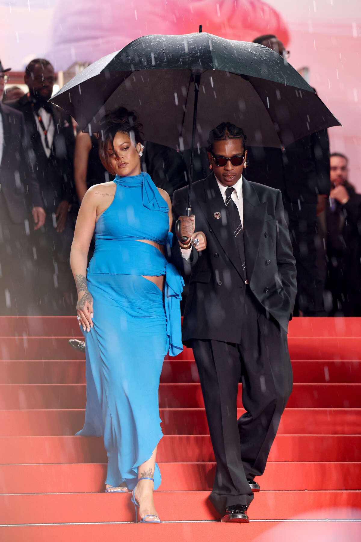 בן זוגה, הראפר אסאפ רוקי, לבש חליפה שחורה אלגנטית בעלת גזרה מעט רחבה במכנסיים של בית האופנה סאן לורן. הוא שילב כמה טבעות, עגילי כסף צמודי אוזן ומשקפיים קלאסיים של Ray-Ban. הראפר עזר לריהאנה לרדת במדרגות והגן עליה מפני הגשם בעזרת מטרייה.