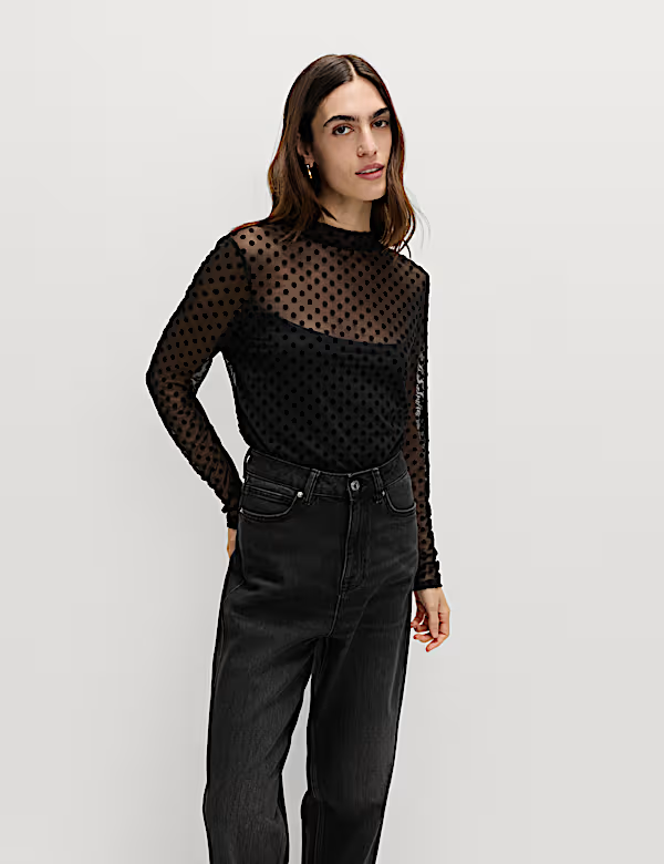 חולצה בעלת צווארון גולף עם נקודות על גבי בד שקוף, גם קלאסי וגם טרנדי.