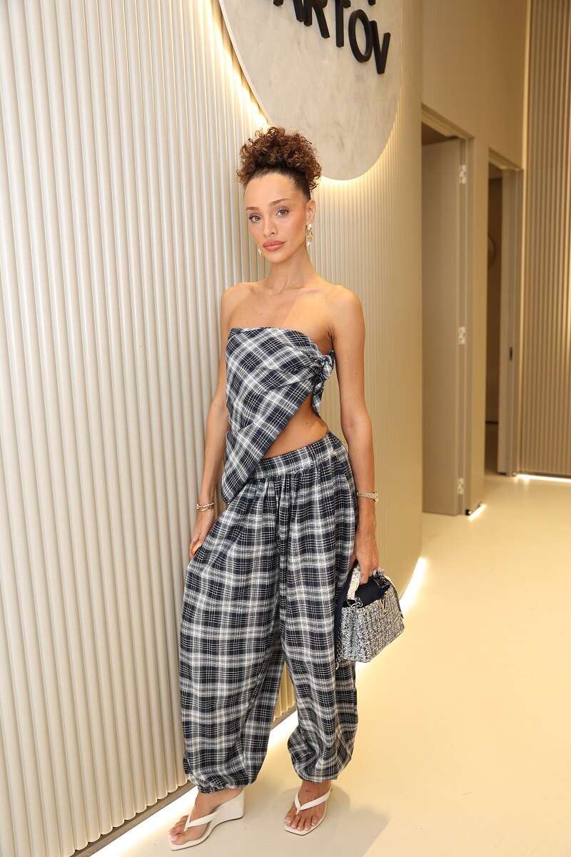 עדן פינס הוכיחה שוב למה היא נחשבת לאחת הנשים הכי שיקיות בארץ. הלוק שלה הוא שיעור מושלם באיזון בין נועזות לאלגנטיות, בד משובץ שמקבל חיים חדשים בזכות גזרה לא צפויה, חשיפה מדויקת ושיק אישי שקשה להתעלם ממנו. הגזרה הא-סימטרית של הטופ מחמיאה לגוף בצורה אלגנטית ומעניקה מראה קליל אך מתוחכם, וההתאמה המדויקת בין המכנסיים הרחבים לכפכפים הלבנים מוסיפה תחושת זרימה מודרנית. פינס מצליחה לשדר יוקרה גם בלי נצנצים או אקססוריז מוגזמים, רק בזכות נוכחות, טעם משובח וביטחון עצמי.