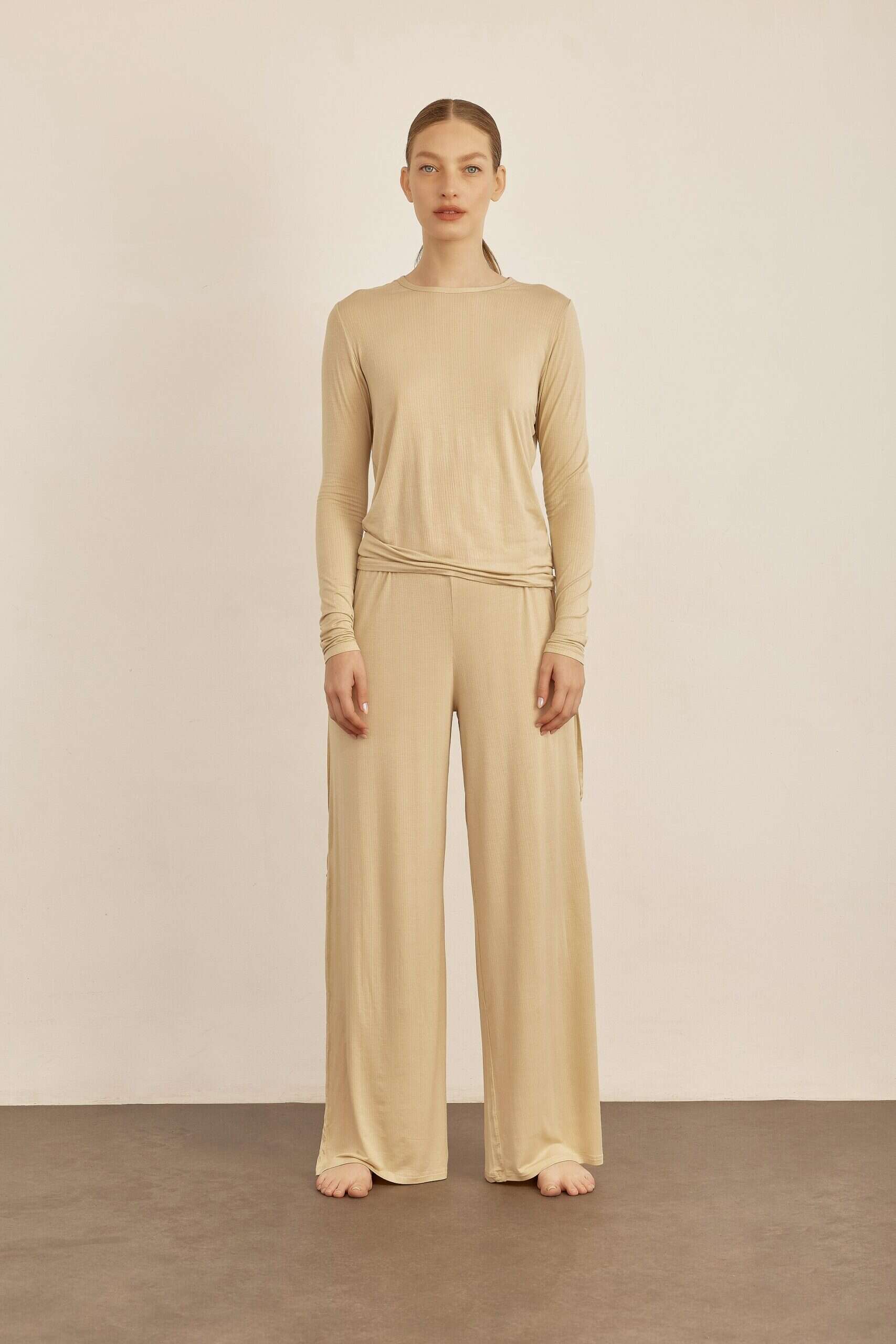 הקולקציה עשויה כולה מהבד החדש והמפנק של העונה: BUTTER SOFT RIB, בד מיקרו מודל בטקסטורת ריב עדינה, קליל, נושם ורך במיוחד. אפשר למצוא מספר דגמים מאותו הבד, גופייה עם חזייה פנימית, מכנסי בוי שורטס תואמים או סט ארוך. כל הדגמים מגיעים בגוון חול או שחור קלאסי, מהסוג שמשדר ניקיון ואלגנטיות.